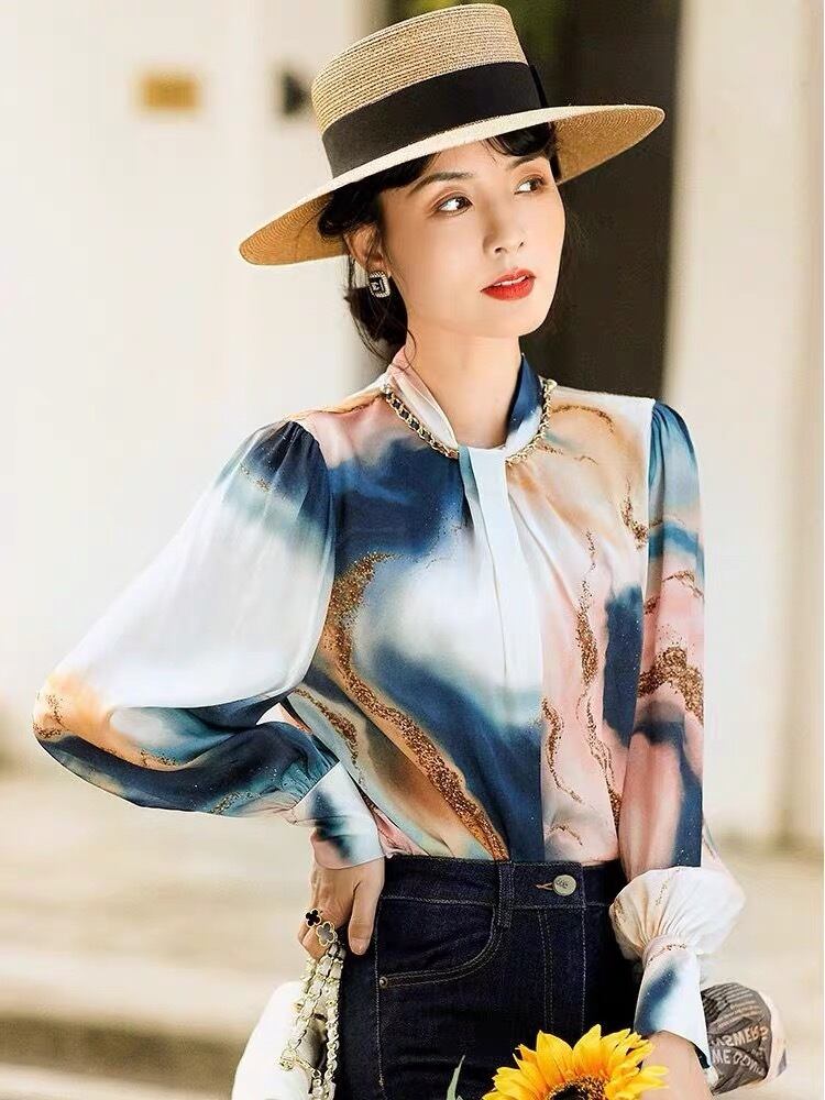Pinkoz 女性ブラウス ビーズ クリスタル スタンド ネック フル スリーブ シフォン ルーズ サイズ デザイナー スタイリッシュ シャツ ファム トップス グラデーション プリント ピンク フェミニン