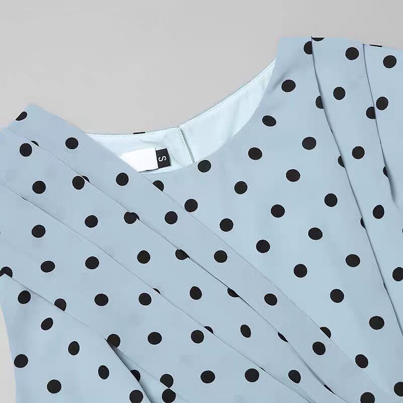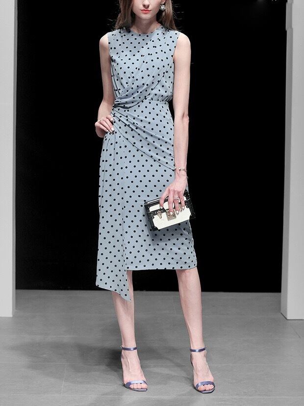 Pinkoz エレガントなブルー水玉鉛筆ミディ ドレス女性 O ネック不規則なフリル ノースリーブ夏パーティー オフィス レディ ドレス z ピンク ラッフル サマー 夏物 Oネック 会社 学校 通勤や通学にも
