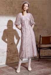 Pinkoz 滑走路デザイナー ピンク ミディ ドレス スパンコール高級ビーズ刺繍 v ネック ボタン パーティー ドレス パフ スリーブ vestidos za Vネック