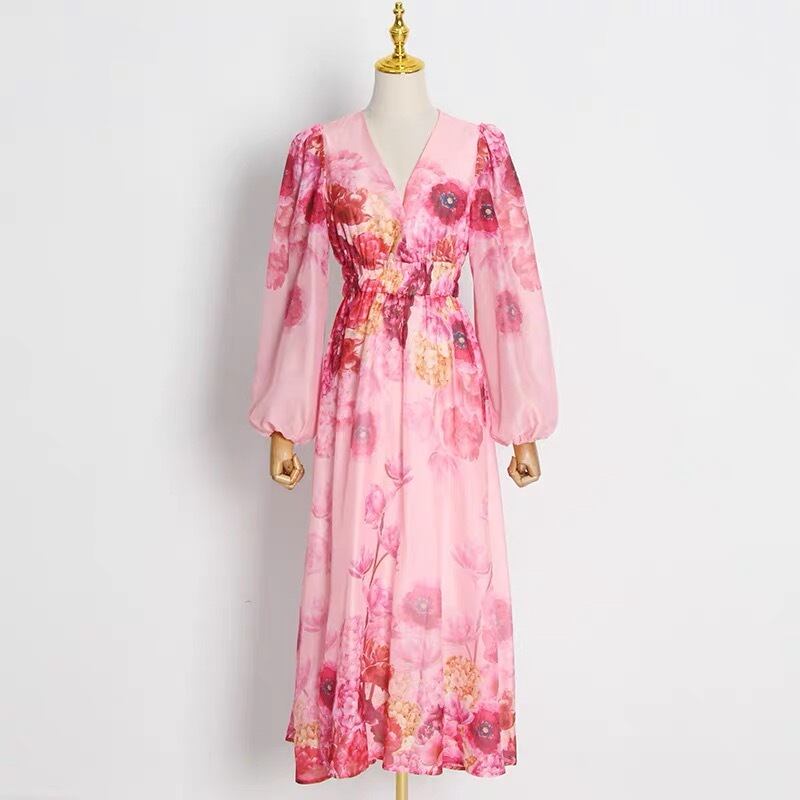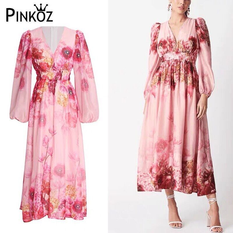 Pinkoz デザイナー赤い花プリント v ネック ランタン スリーブ秋春マキシ ドレス弾性ウエスト パーティー自由奔放に生きるスタイリッシュな vestidos traf ピンク レッド ランタンスリーブ エラスティック 伸縮 スプリング 春物 オータム 秋物 Vネック フラワーデザイン