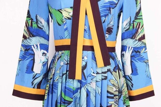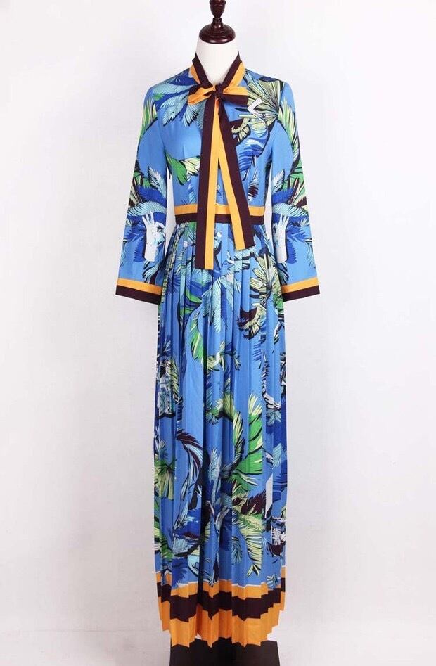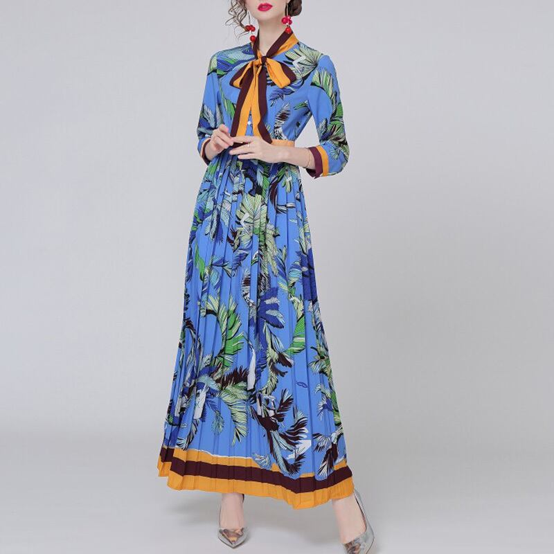 Pinkoz 滑走路デザイナー ブルー マキシ ドレス女性弓襟春秋フローラル プリント自由奔放に生きるローブ カジュアル プリーツ vestidos traf ピンク リボン スプリング 春物 オータム 秋物 花柄