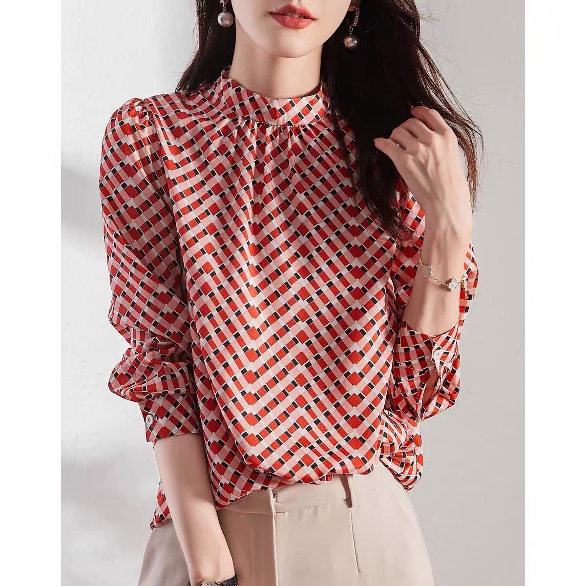 Pinkoz レディース ランウェイ デザイナー レッド チェック柄 プリント ランタン スリーブ ブラウス レディース スタンドカラー ヴィンテージ エレガント シック 作業服 シック ピンク ランタンスリーブ ビンテージ