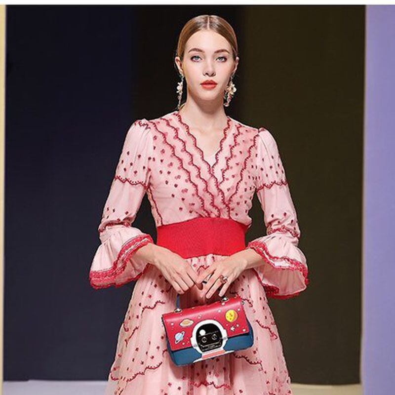 Pinkoz ドレス夏の女性メッシュ花刺繍レース フレア スリーブ V ネック膝丈ドレス ピンク フレアスリーブ サマー 夏物 Vネック フラワーデザイン
