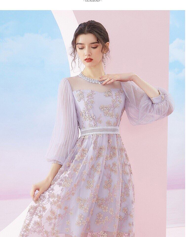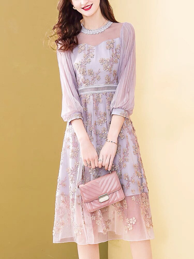 Pinkoz 妖精ミニ ドレス ヴィンテージ バイオレット ランタン スリーブ花刺繍春夏パーティー ミディ ドレス メッシュ ライトぬるぬるローブ ピンク ランタンスリーブ スプリング 春物 サマー 夏物 フラワーデザイン ビンテージ