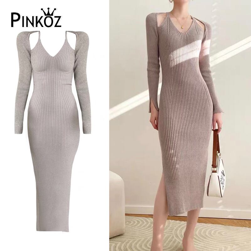Pinkoz V ネック休日エレガントなセーターミディドレス中空アウト女性スパゲッティストラップグレーのセクシーなビーチの女性のファッション vestidos ピンク Vネック