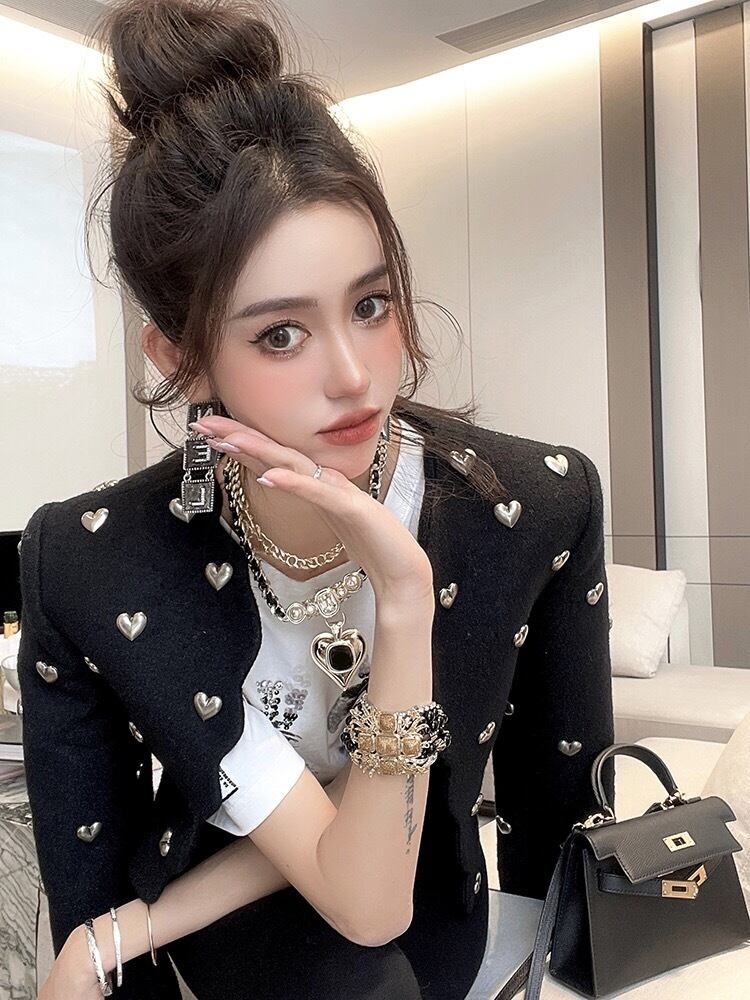 Pinkoz 滑走路デザイナー黒エレガントなショート コート ハート愛ビーズ秋冬ファッション女性ツイード ジャケット roupas femininas za ピンク ブラック オータム 秋物 ウィンター 冬物 フェミニン