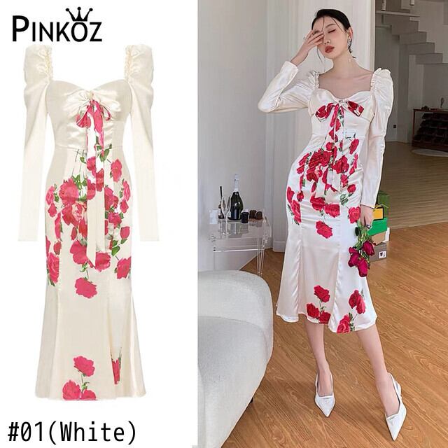 Pinkoz 滑走路デザイナー女性休日ぬるぬる女性スクエアカラーミディドレス赤花柄プリント春マーメイド vestidos ローブ traf ピンク レッド スプリング 春物 ドレス スクウェア