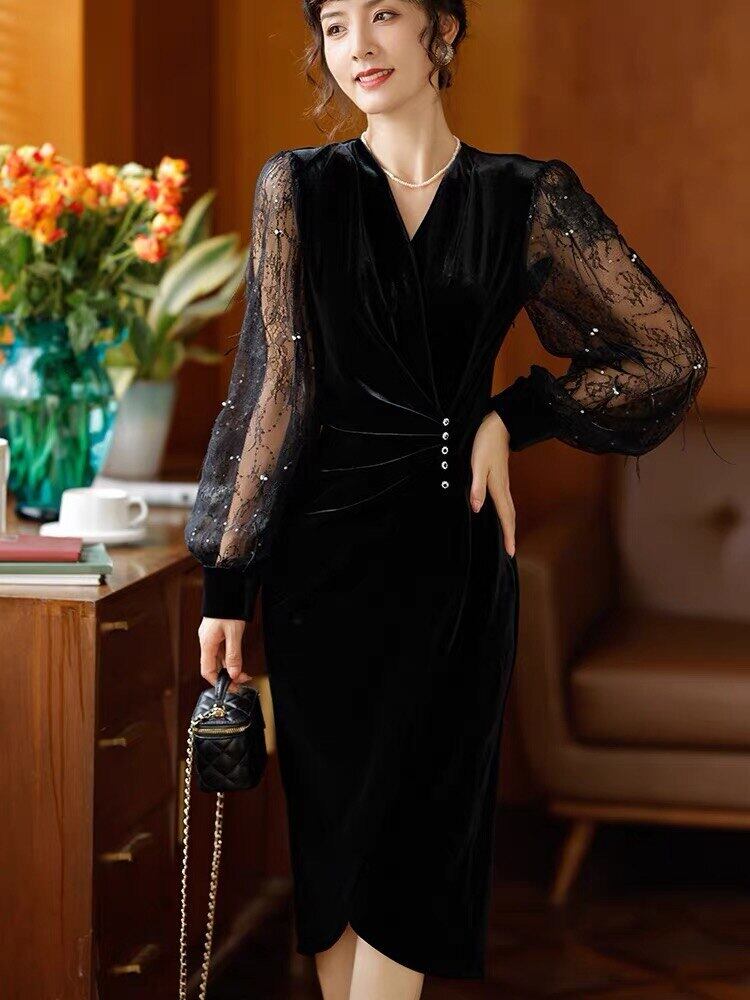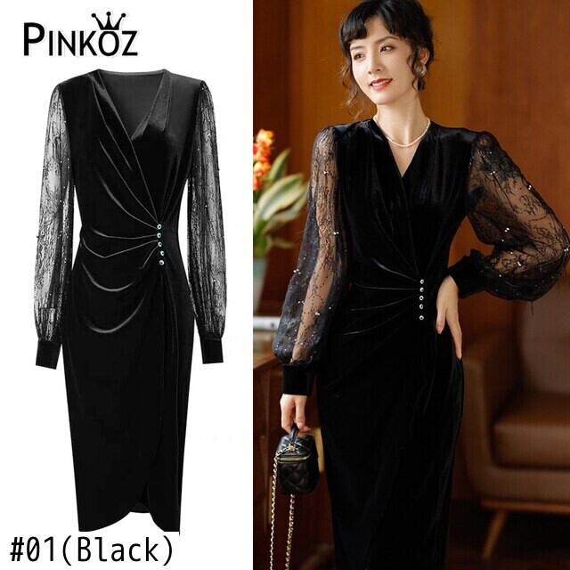 Pinkoz 女性 v ネック パッチワーク レース スリーブ ベルベット ドレス ボタン クリスタル エレガントなオフィス レディ フォールド vestidos ヴィンテージ ファッション ローブ ピンク Vネック ビンテージ 会社 学校 通勤や通学にも