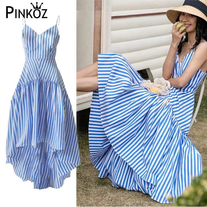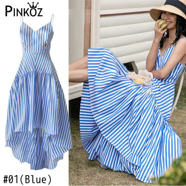 Pinkoz デザイナー スタイリッシュなブルー ストライプ スパゲッティ ストラップ夏非対称マキシ ドレス フリル ホリデー パーティー ビーチ ドレス ローブ mujer ピンク ラッフル サマー 夏物
