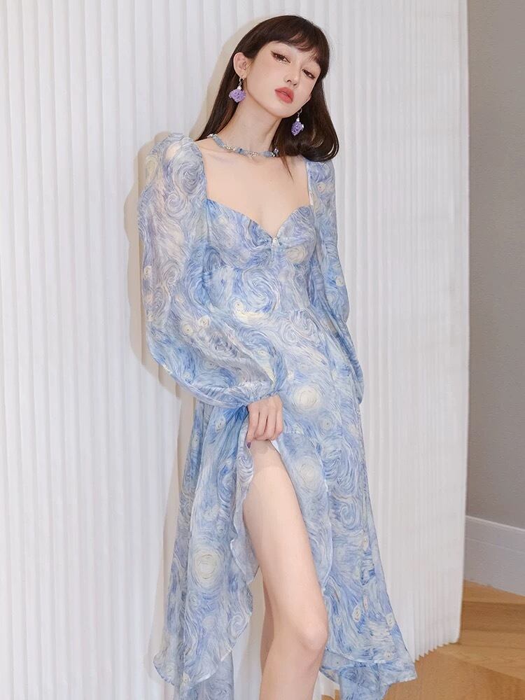 Pinkoz 水色ゴッホの星空パターン恋人襟ランター スリーブ非対称シフォン ドレス パーティー vestidos traf ピンク ブルー 大人ガーリー スウィート キュート カジュアル