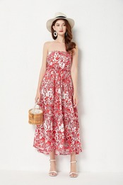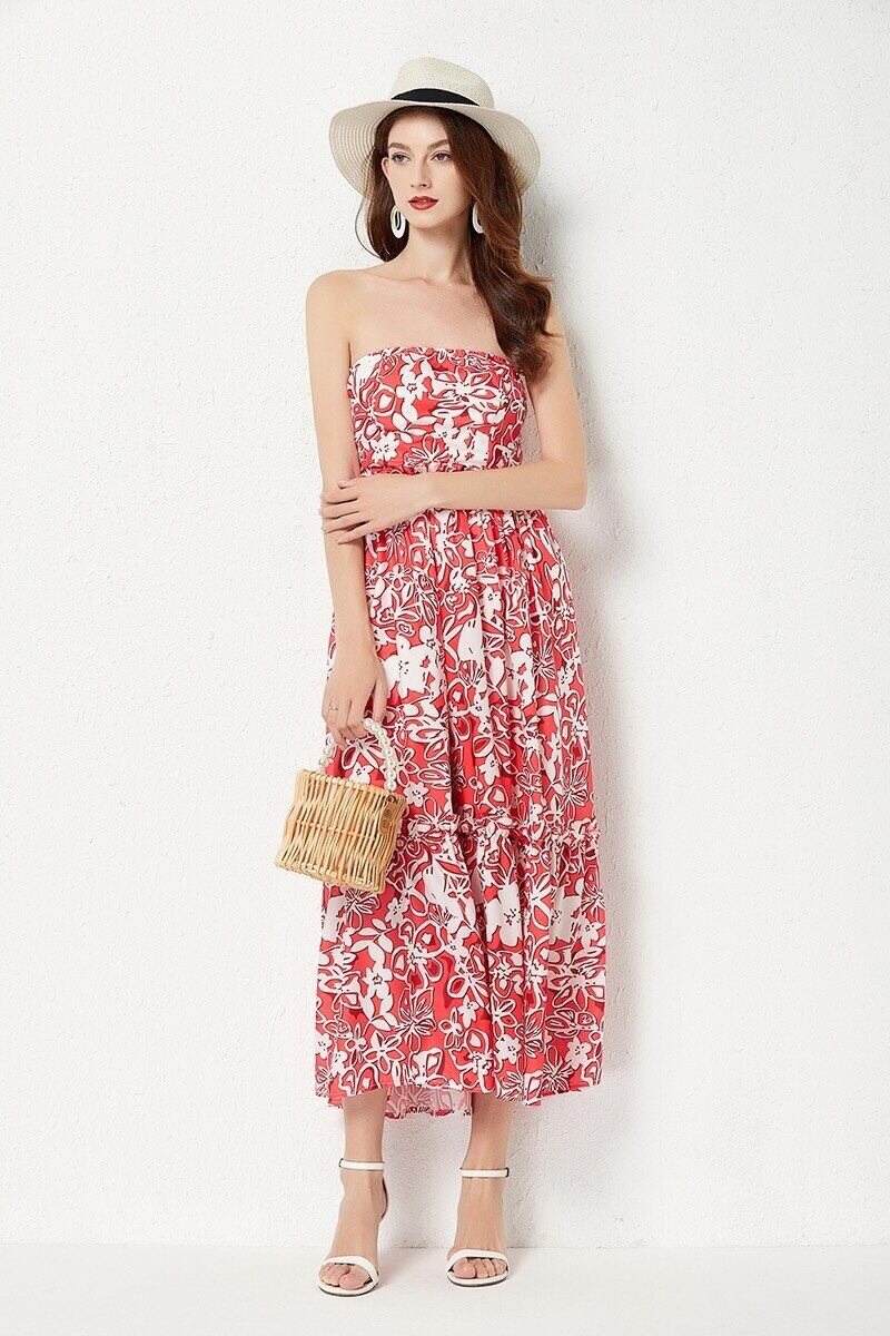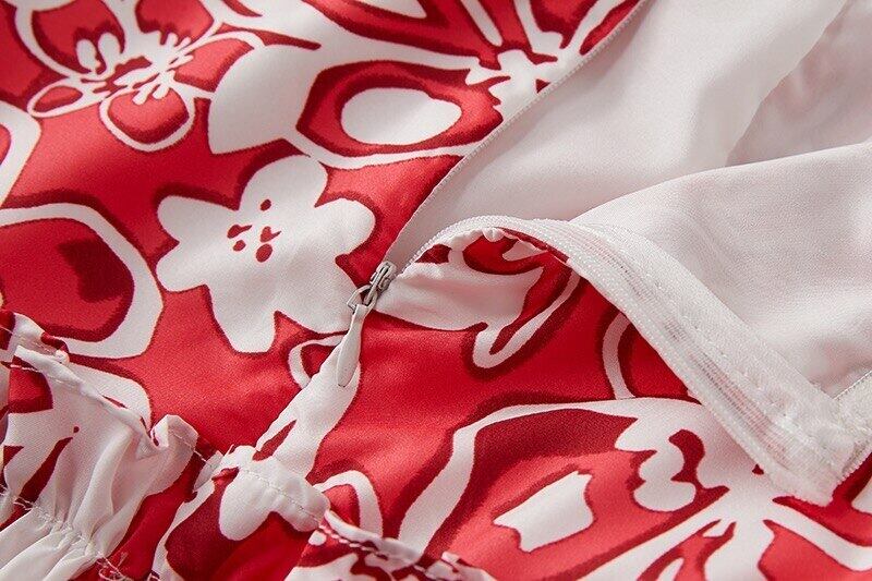 Pinkoz 赤花柄スラッシュネックオフはんだ休日フリルミディドレス女性 A ラインヴィンテージデザイナー vinatge 女性 traf ピンク レッド Aライン ビンテージ