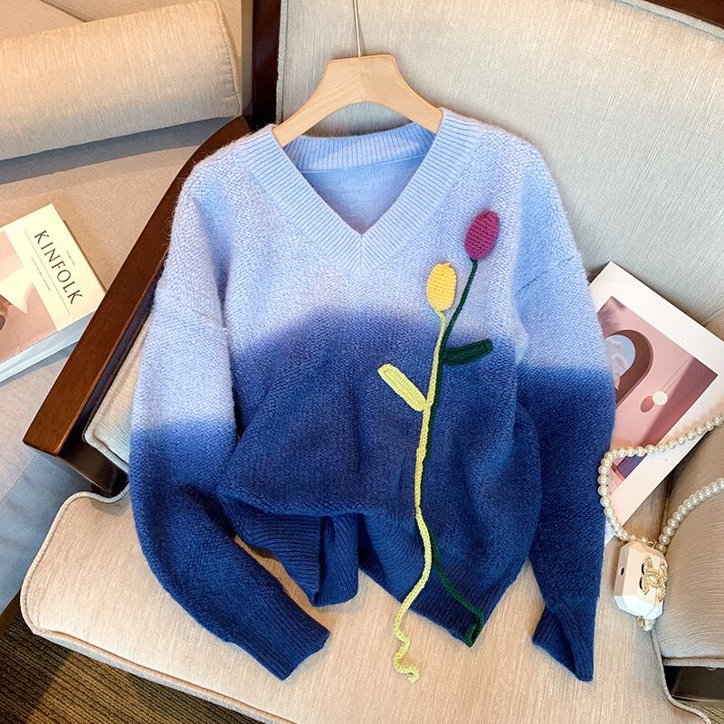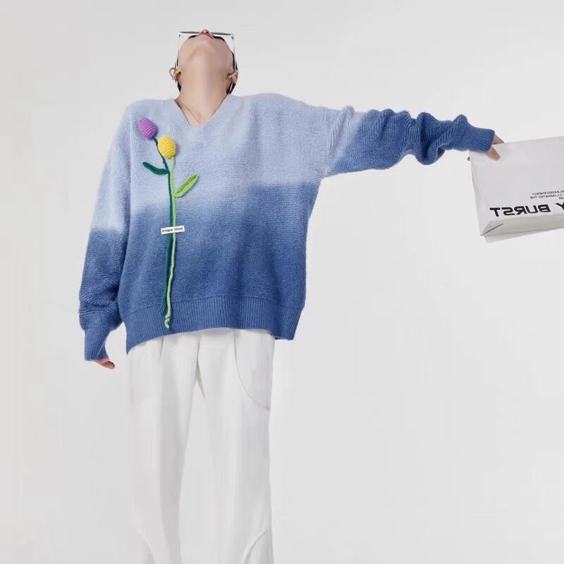 Pinkoz デザイン セーター グラデーション ブルー アップリケ フラワー スウィート 秋冬 Oネック ゆったり ニット プルオーバー ストリート ファッション トップス ピンク 大人ガーリー キュート カジュアル オータム 秋物 ウィンター 冬物 フラワーデザイン