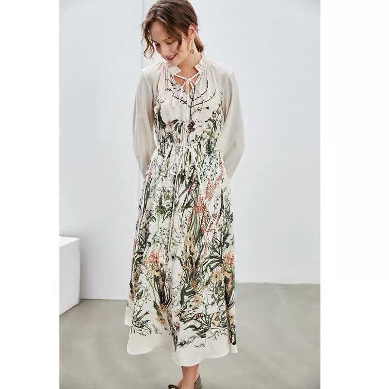 Pinkoz 有名人デザイナー スタイル フレンチ トロピカル花柄プリント ルーズ ミディ ドレス女性秋冬長袖ドレス vestidos ロング ピンク オータム 秋物 ウィンター 冬物