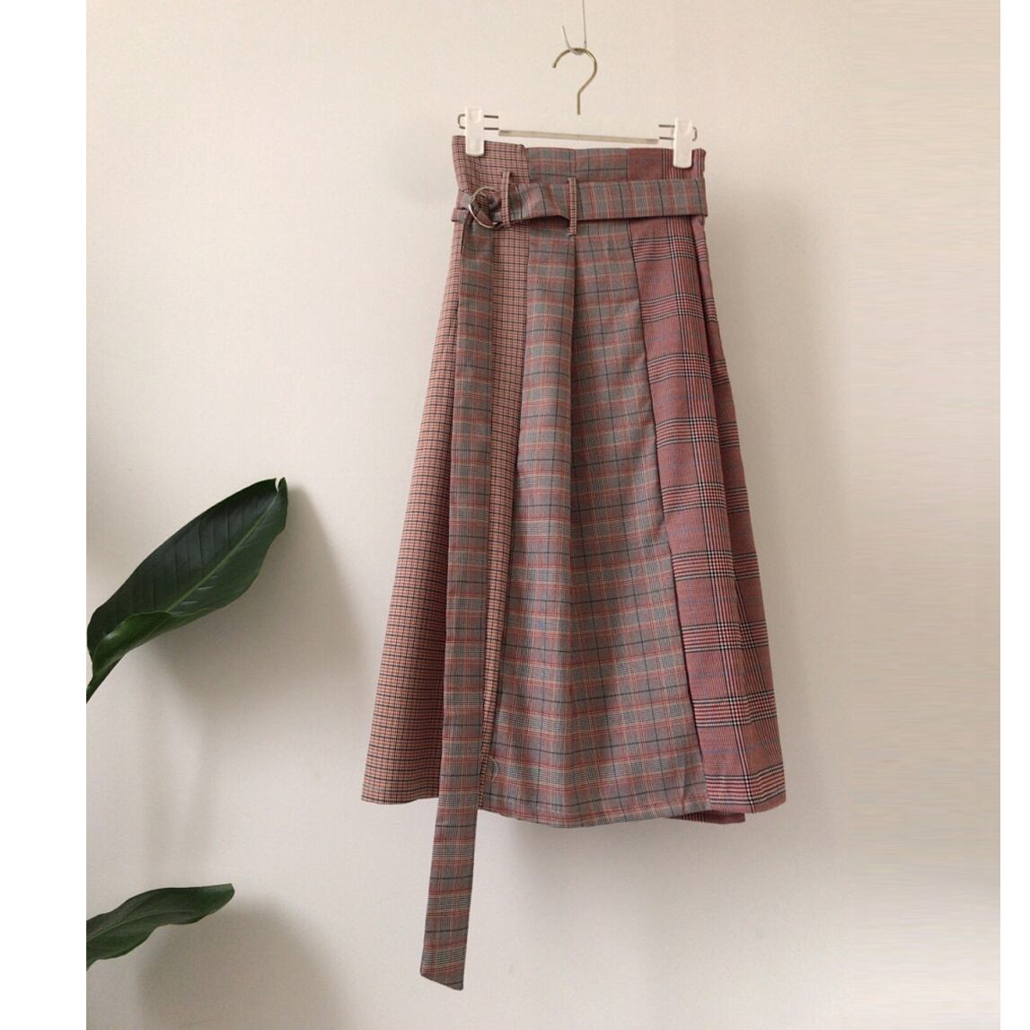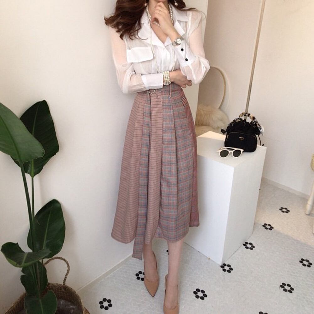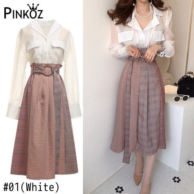 Pinkoz レディース 2点セット 上品 白シャツ 作業着 チェック柄 ミディスカート ベルト付き 2点セット デザイナーズコーデ シックトラフ ピンク ホワイト エレガント ハーネス
