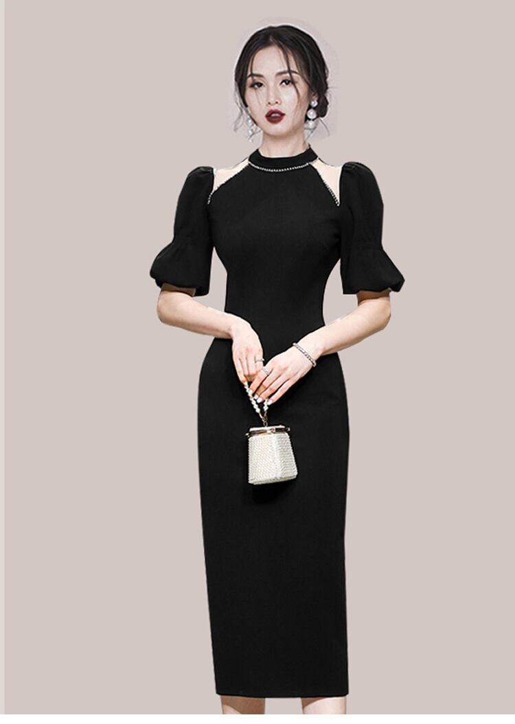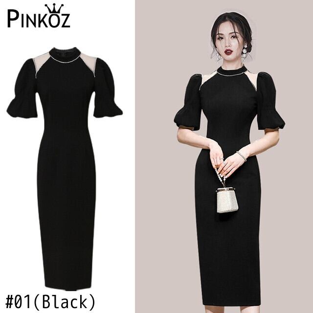 Pinkoz エレガント ヴィンテージ ペンシル ミディ ドレス中空アウト ブラック クリスタル ビーズ パフ スリーブ女性パーティー ドレス デザイナー traf vestidos ピンク ビンテージ