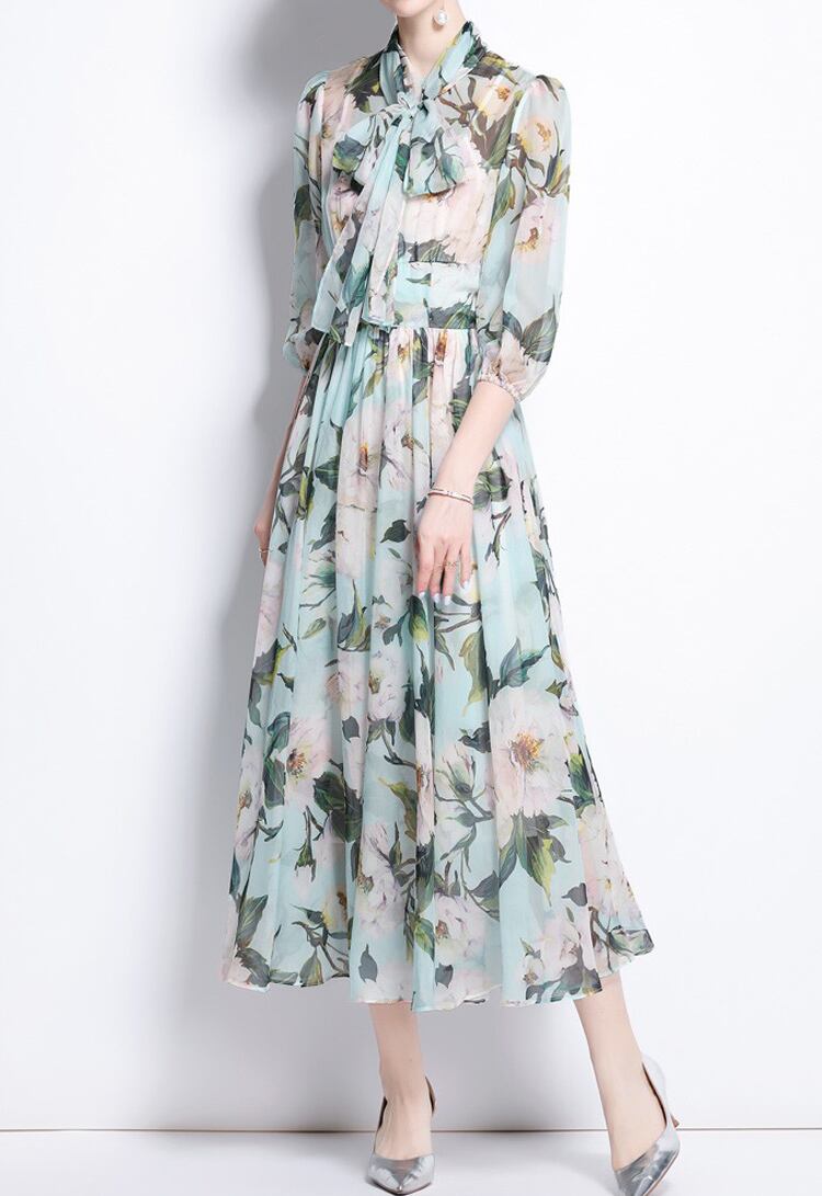 Pinkoz ライトブルーの弓の襟シフォンハイウエストミディドレスの女性の夏春プレーリーシックなプラスサイズのエレガントなドレス traf ハイウェスト ピンク リボン 大きめサイズ スプリング 春物 サマー 夏物