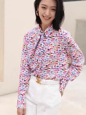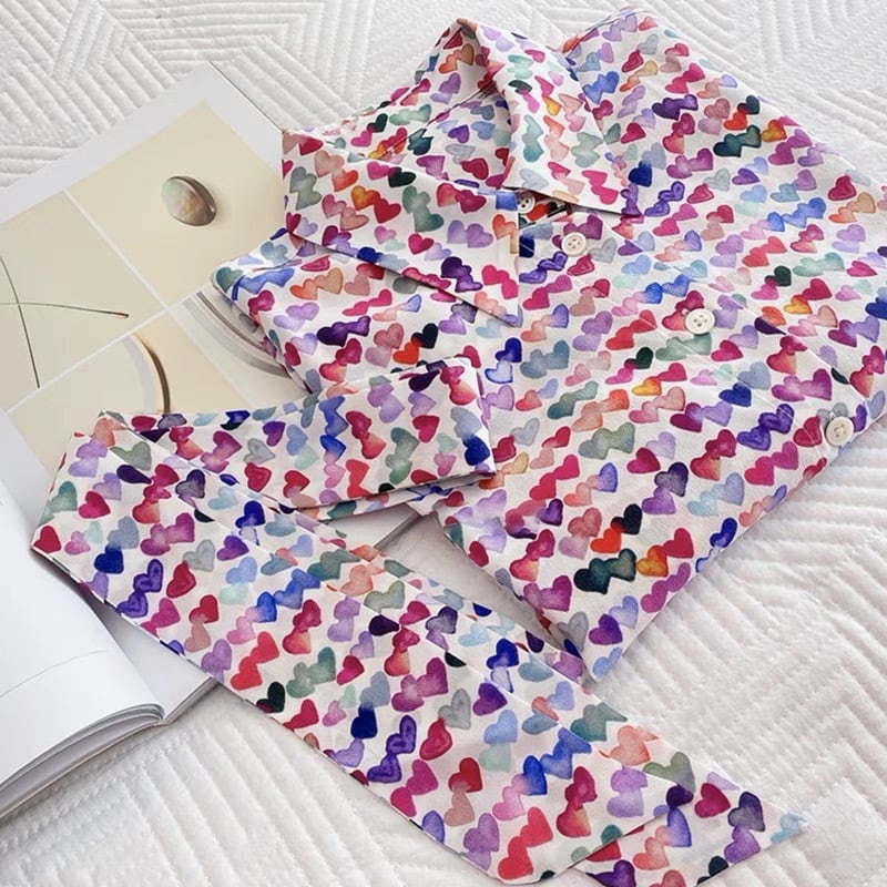 Pinkoz デザイナー ブラウス カラフルなハート愛プリント ターン ダウン襟かわいい甘いシャツ ファッション服ヴィンテージ弓ファム トップ ピンク リボン 大人ガーリー スウィート キュート カジュアル フェミニン ビンテージ