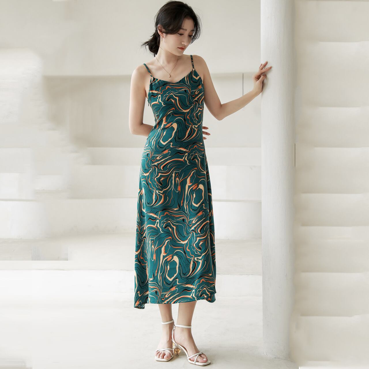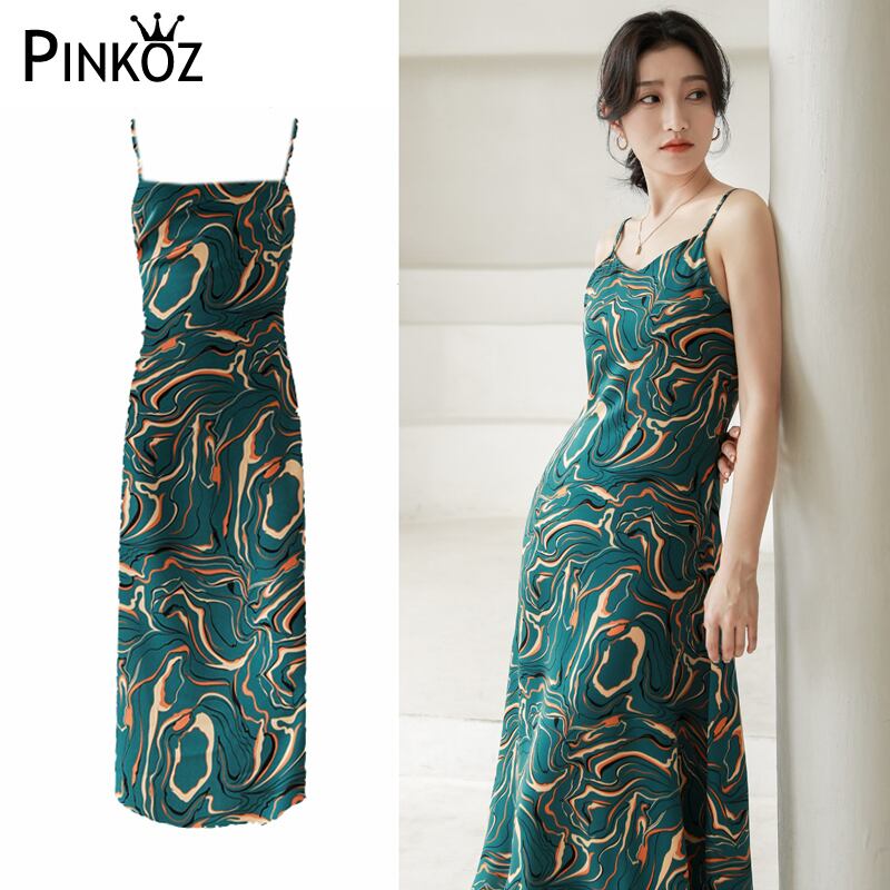 Pinkoz 女性デザイナーミディドレススパゲッティストラップグリーンフローラルプリントセクシーな夏のファムドレスカジュアルキャミソールロング vestidos za ピンク サマー 夏物 花柄 フェミニン