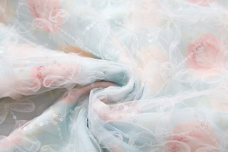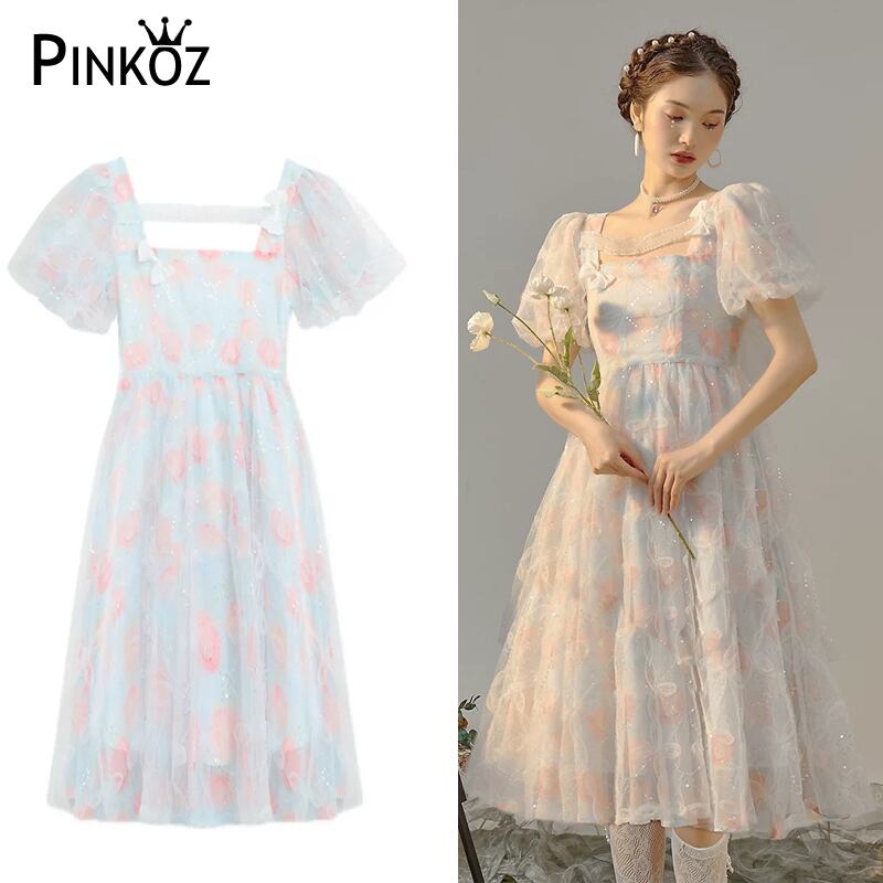 Pinkoz 甘いビーズ メッシュ刺繍スクエア カラー夏ミニ ドレス妖精ファム ドレス A ライン パーティー ローブ ピンク 大人ガーリー スウィート キュート カジュアル サマー 夏物 Aライン フェミニン スクウェア