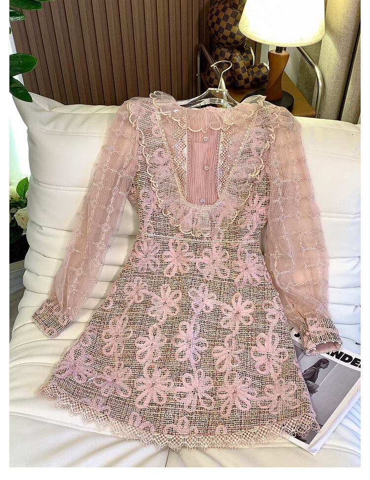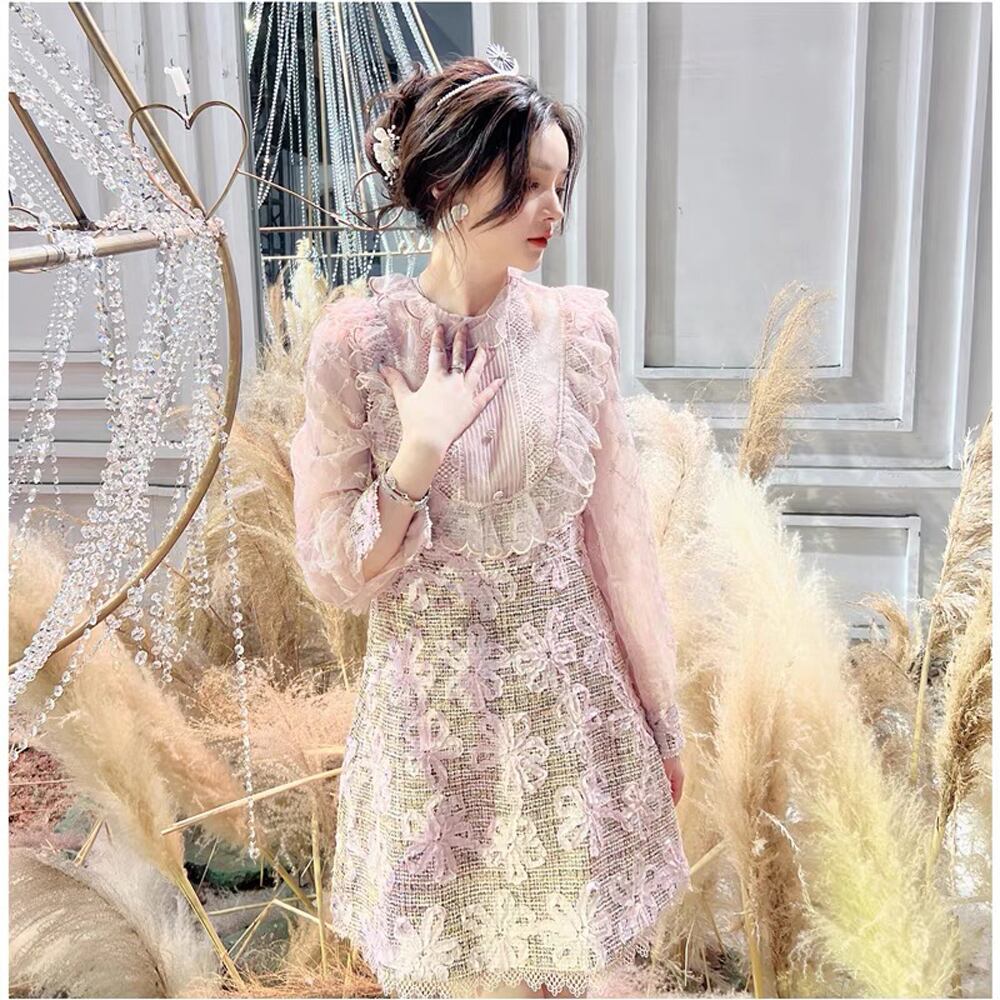 Pinkoz エレガントなヴィンテージ ピンク ミニ ドレス パッチワーク レースシャーリング フリル ビーズ ボタン刺繍 A ラインの高級ドレス vestidos ラッフル Aライン ビンテージ
