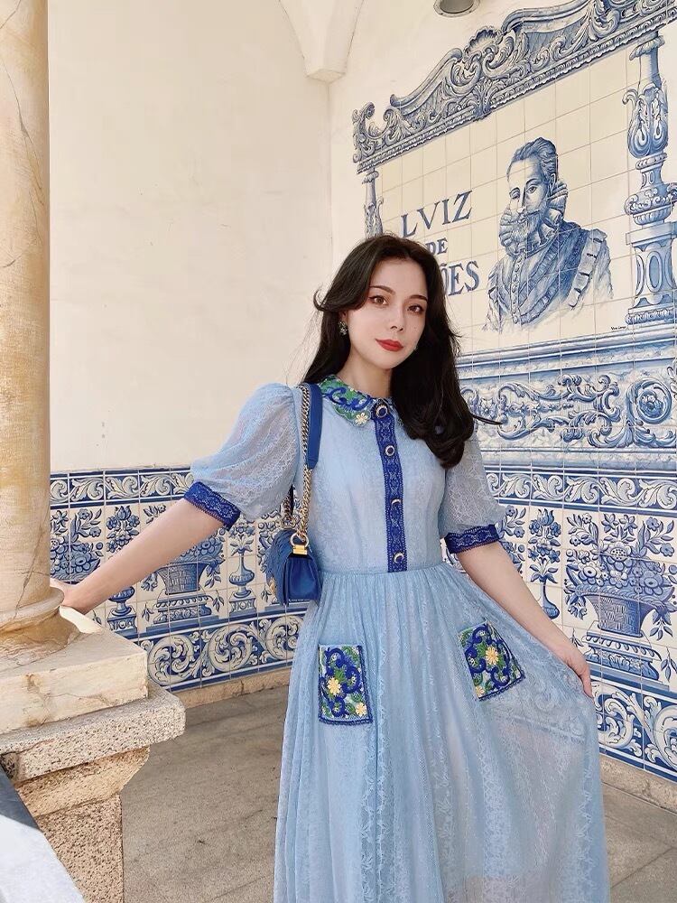 Pinkoz 女性ヴィンテージブルー刺繍ピーターパン襟ポケットミディパッチワークレースメッシュパーティーエレガントフレンチドレスファッション ピンク ビンテージ
