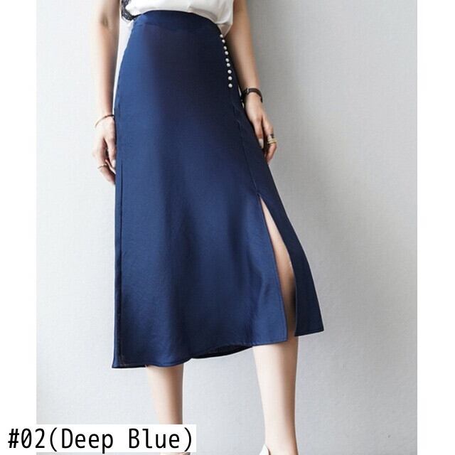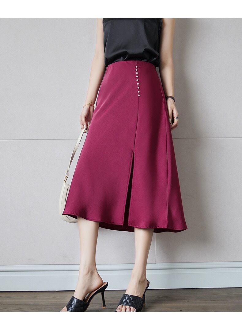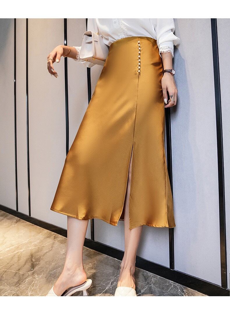 Pinkoz ゴールデンサテンミディスカート女性ぬるぬるマーメイドボタンスプリットエレガントなオフィスレディハイウエスト ペチコート faldas 女性スカート ハイウェスト ピンク 会社 学校 通勤や通学にも