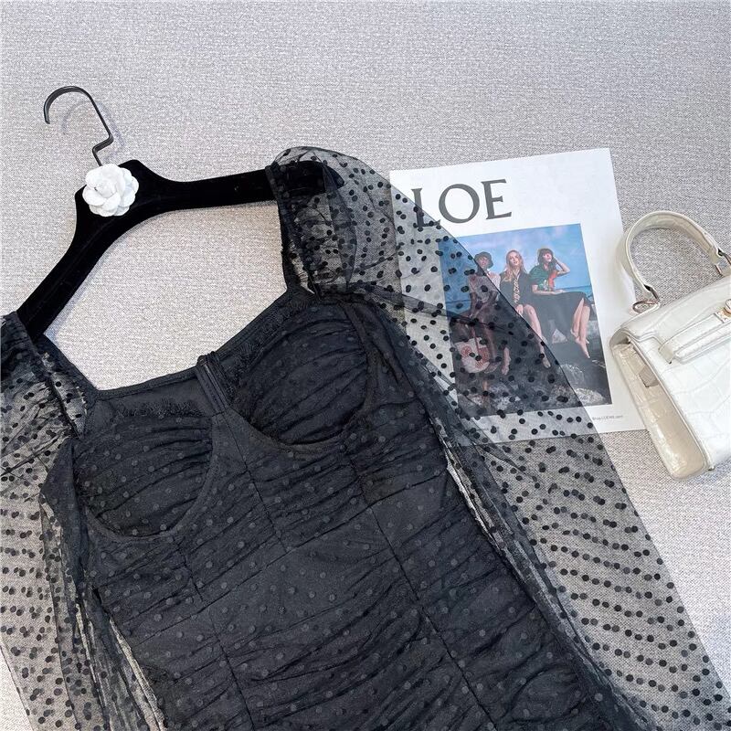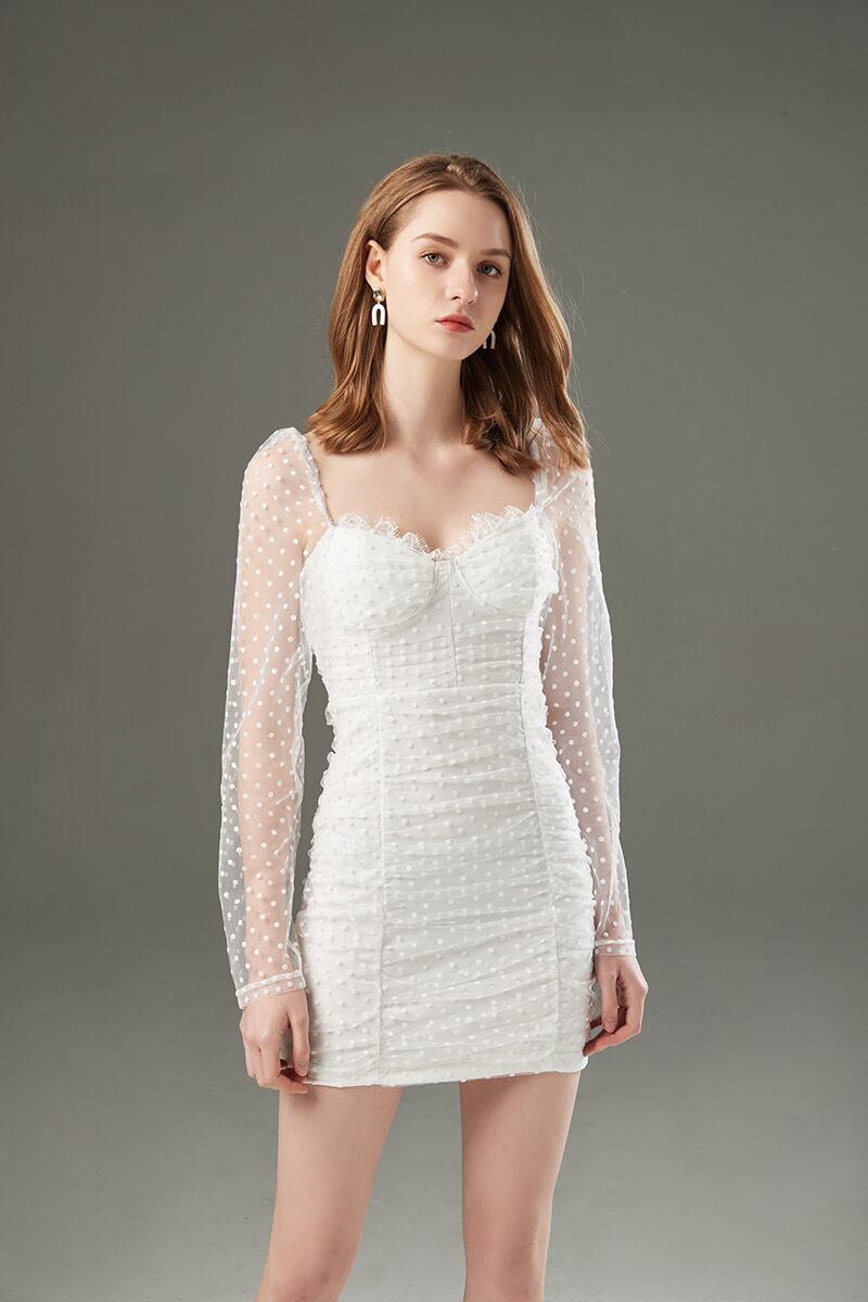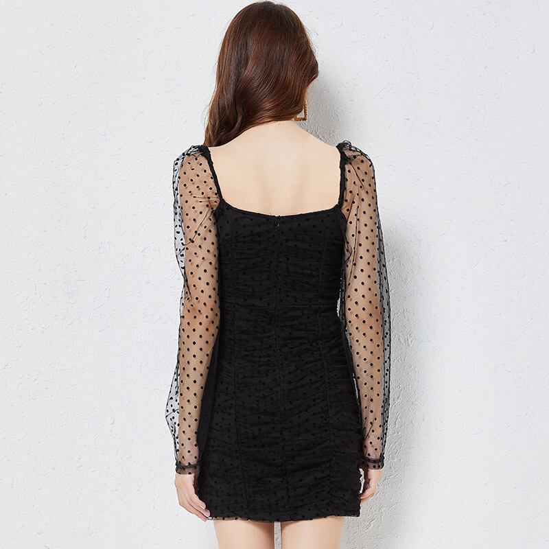 Pinkoz セクシーな恋人の襟フルスリーブメッシュポルカドットぬるぬるボディコンミニドレスホワイトブラックセクシーなパーティーナイトvestidos traf ピンク 大人ガーリー スウィート キュート カジュアル
