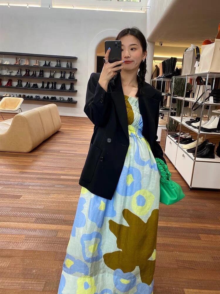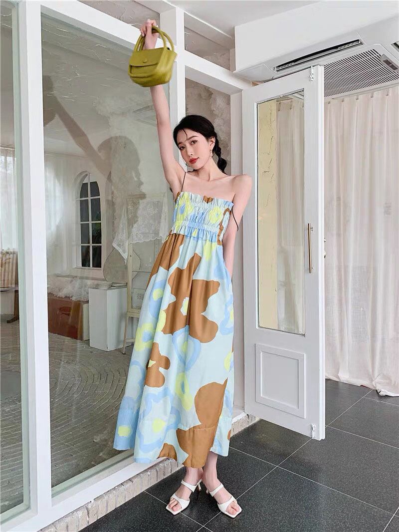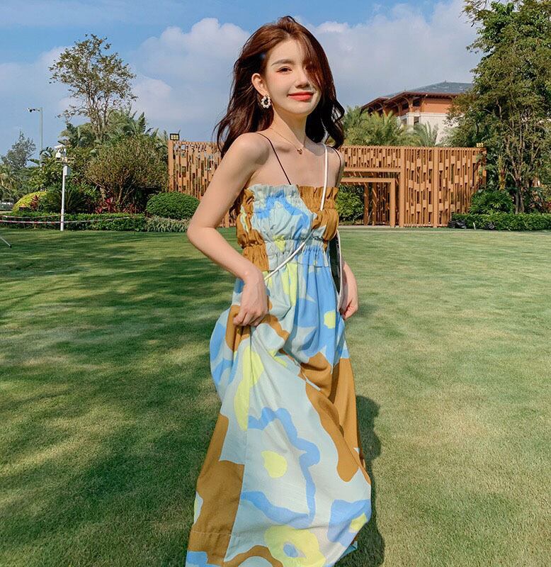 Pinkoz 女性休日スパゲッティ stap 絵画プリントシャーリング緩い自由奔放に生きるミディドレスキャミソール夏カジュアルファムドレス vestidos ピンク サマー 夏物 フェミニン