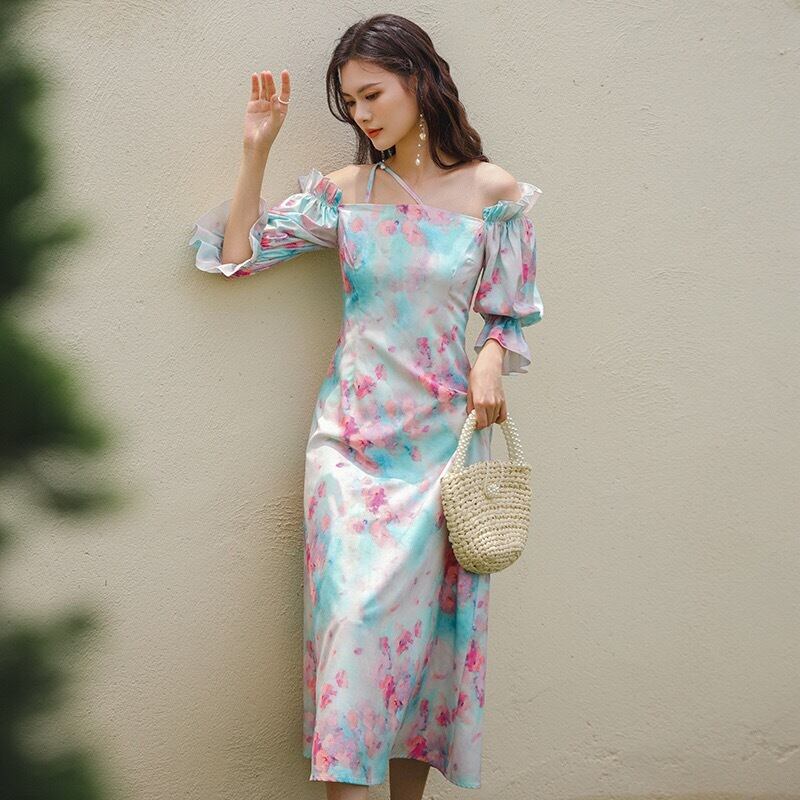 Pinkozカジュアルホリデーミディドレス美的プリントスラッシュネックフレアスリーブシャーリングファッションカジュアルサマーニュードレスvestidos y2k ピンク 夏物