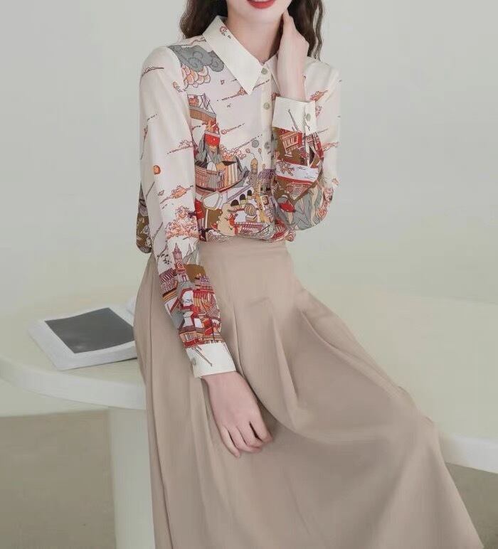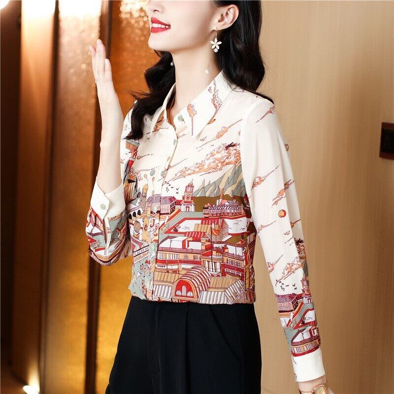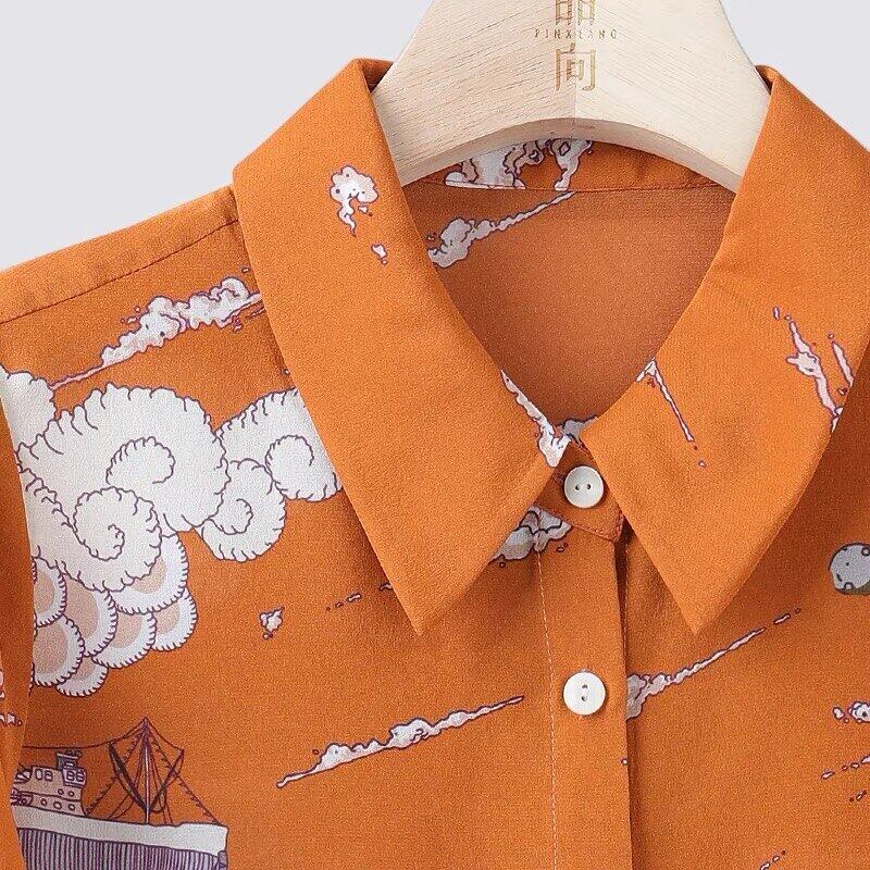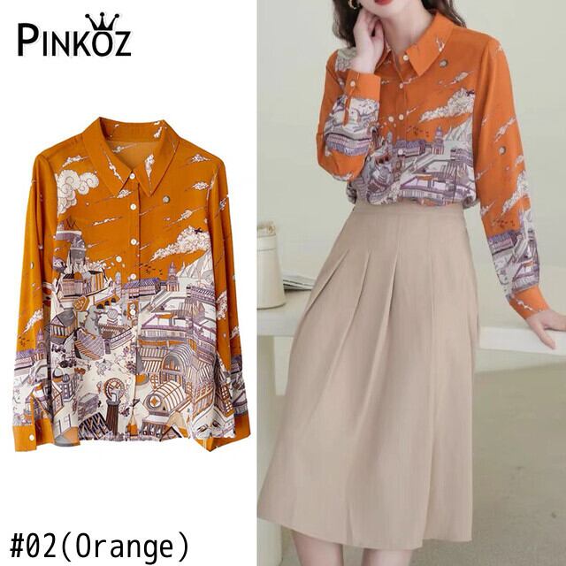 Pinkoz 女性ブラウス シングル ブレスト ポロネック長袖春秋ファム トップス オレンジ プリント カジュアル ビッグ サイズ 3xl シャツ za ロング ピンク スプリング 春物 オータム 秋物 Oネック フェミニン