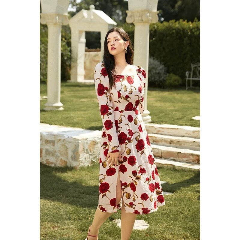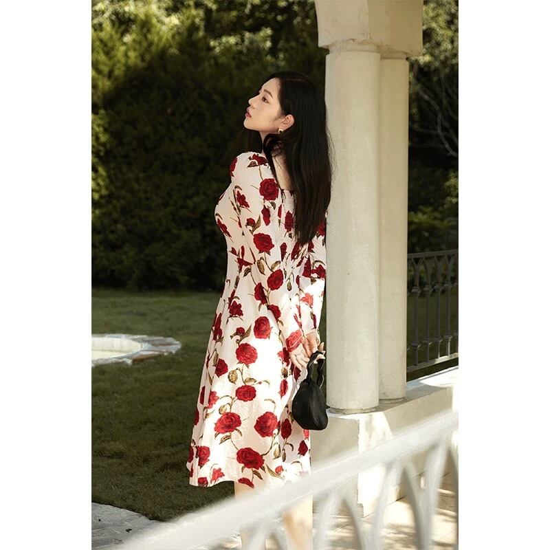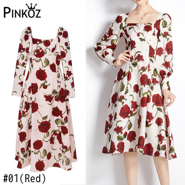 Pinkoz 女性赤い花プリントスクエアカラーフルスリーブ春秋 A ラインドレスファムヴィンテージ elgant フレンチローブデ mujer ピンク レッド スプリング 春物 オータム 秋物 Aライン フェミニン フラワーデザイン スクウェア ビンテージ