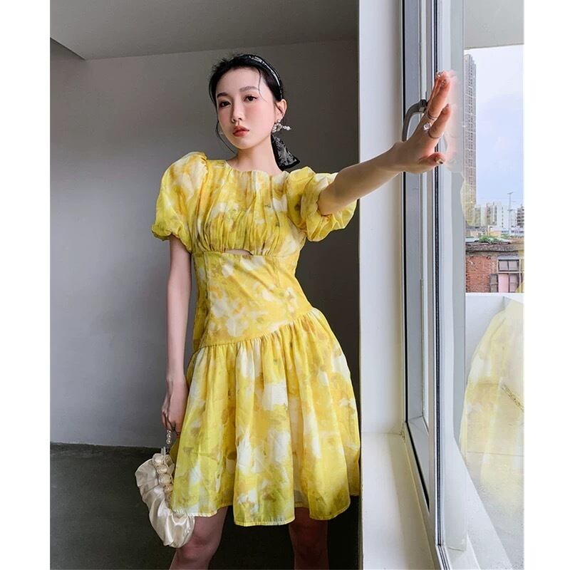 Pinkoz desigenr スタイリッシュな黄色の花プリント中空アウト女性ミニドレスパフスリーブ夏休みvestidosデベラノmujer ピンク サマー 夏物 花柄