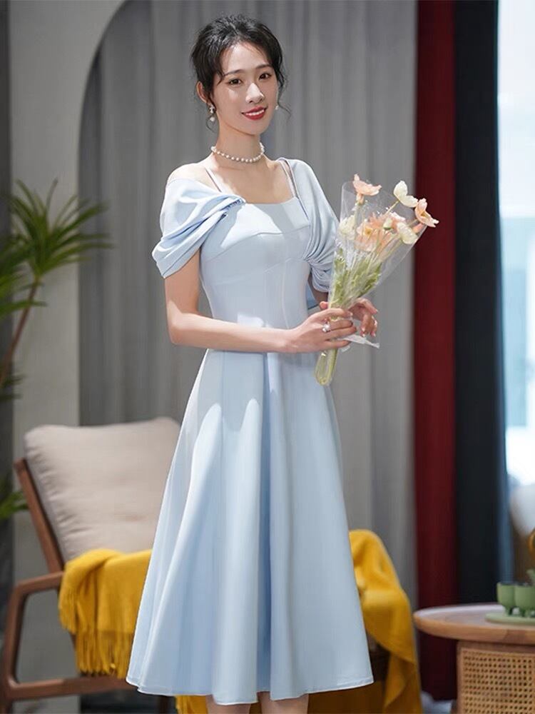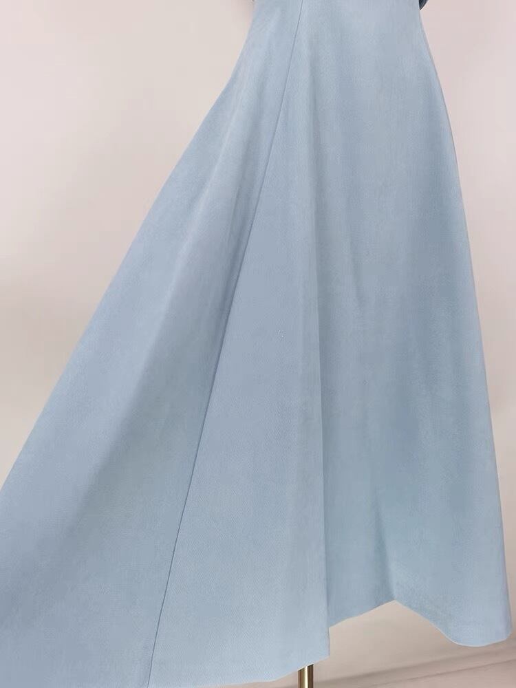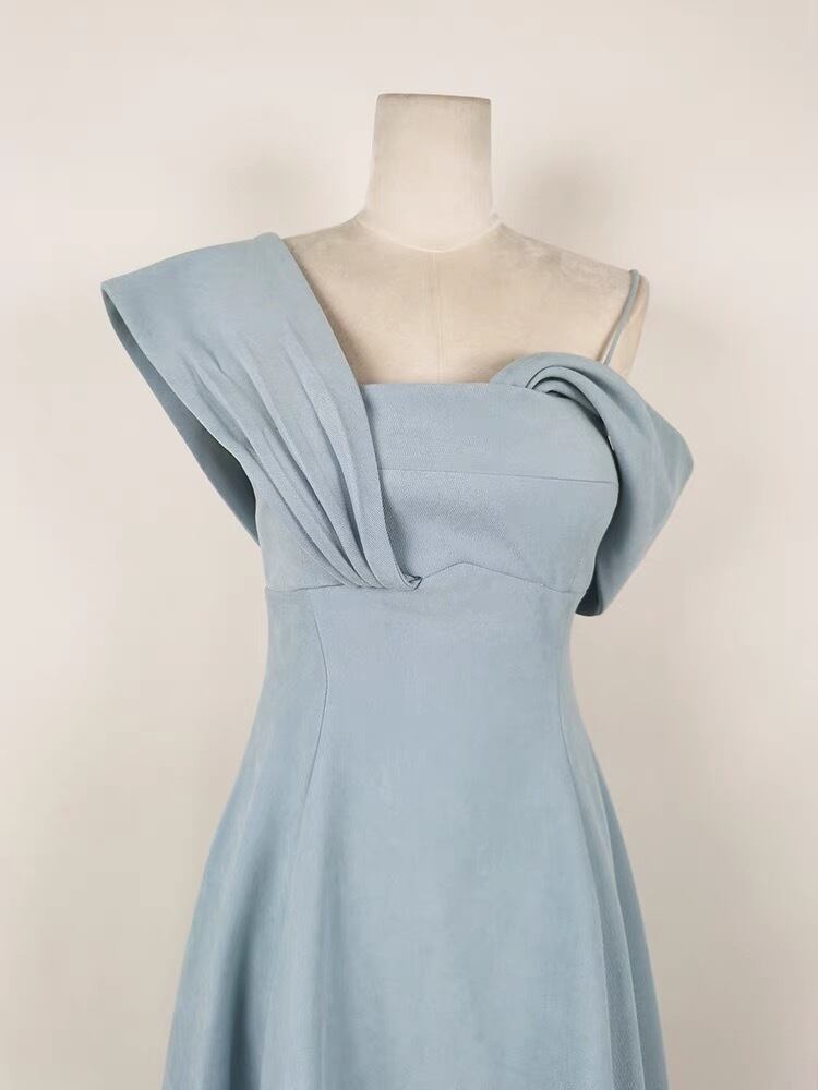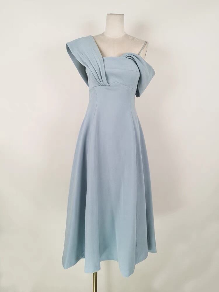 Pinkoz 滑走路デザイナー ライト ブルー ミディ A ライン ドレス不規則なスラッシュ ネックぬるぬるパーティー イブニング ナイト ドレス夏シックな vestidos ピンク サマー 夏物 Aライン