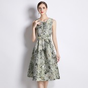 Pinkoz 女性エレガントな O ネック ミディ ドレス ジャカード花ノースリーブ ヴィンテージ ファッション夏秋パーティー ドレス A ライン vestidos ピンク サマー 夏物 オータム 秋物 Oネック Aライン フラワーデザイン ビンテージ