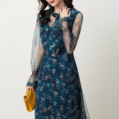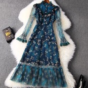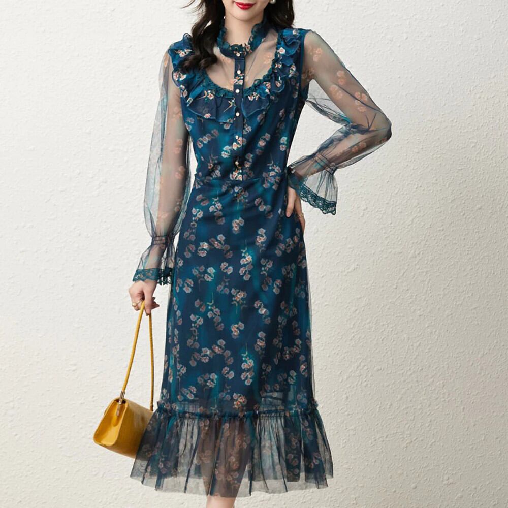 Pinkoz 女性エレガントなミディ ドレス メッシュ花柄プリント スタンド カラー フレア スリーブ春夏パーティー ナイト ドレス ローブ デ mujer za ピンク フレアスリーブ スプリング 春物 サマー 夏物