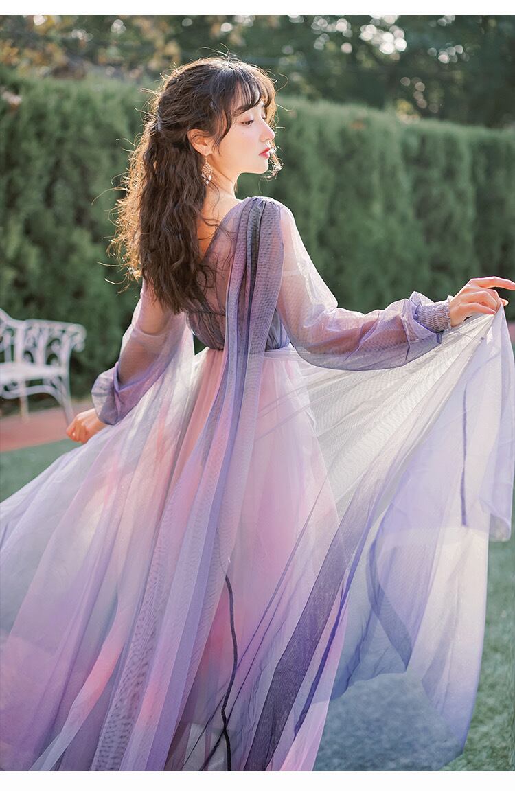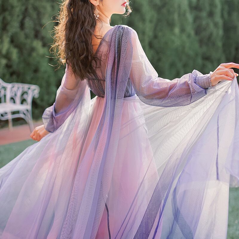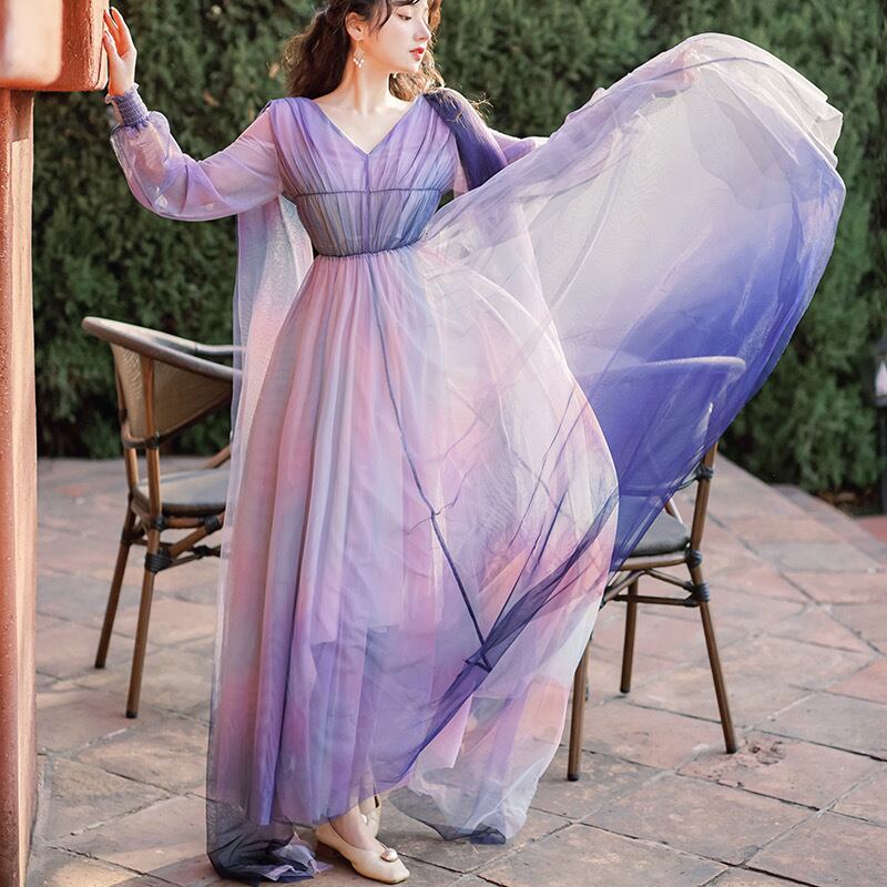 Pinkoz ビーチ マキシドレス フェアリー ボヘミアン バケーション グラデーション パープル ロング 気質 バックレス Vネック シフォン パーティー ローブ ピンク