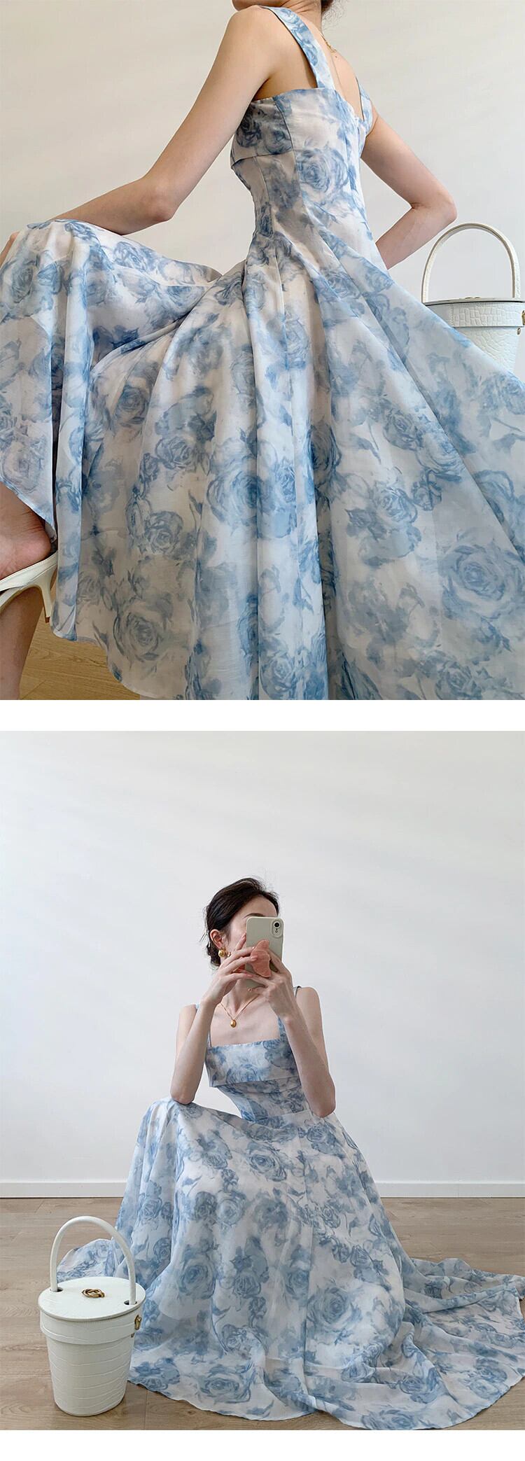 Pinkoz 女性ヴィンテージミディドレスローズフラワープリントスパゲッティストラップ夏パーティー A ラインドレスローブデ mujer traf ピンク サマー 夏物 Aライン フラワーデザイン ビンテージ