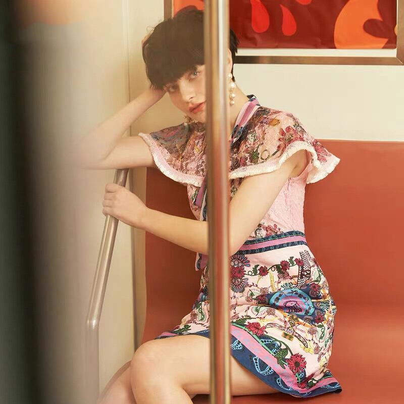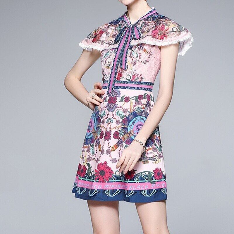 Pinkoz 滑走路スタイリッシュなピンク花柄プリント パッチワーク ミニ ドレス半袖夏パーティー弓電話エレガントなドレス ナイト ローブ z ショート リボン ハーフスリーブ サマー 夏物