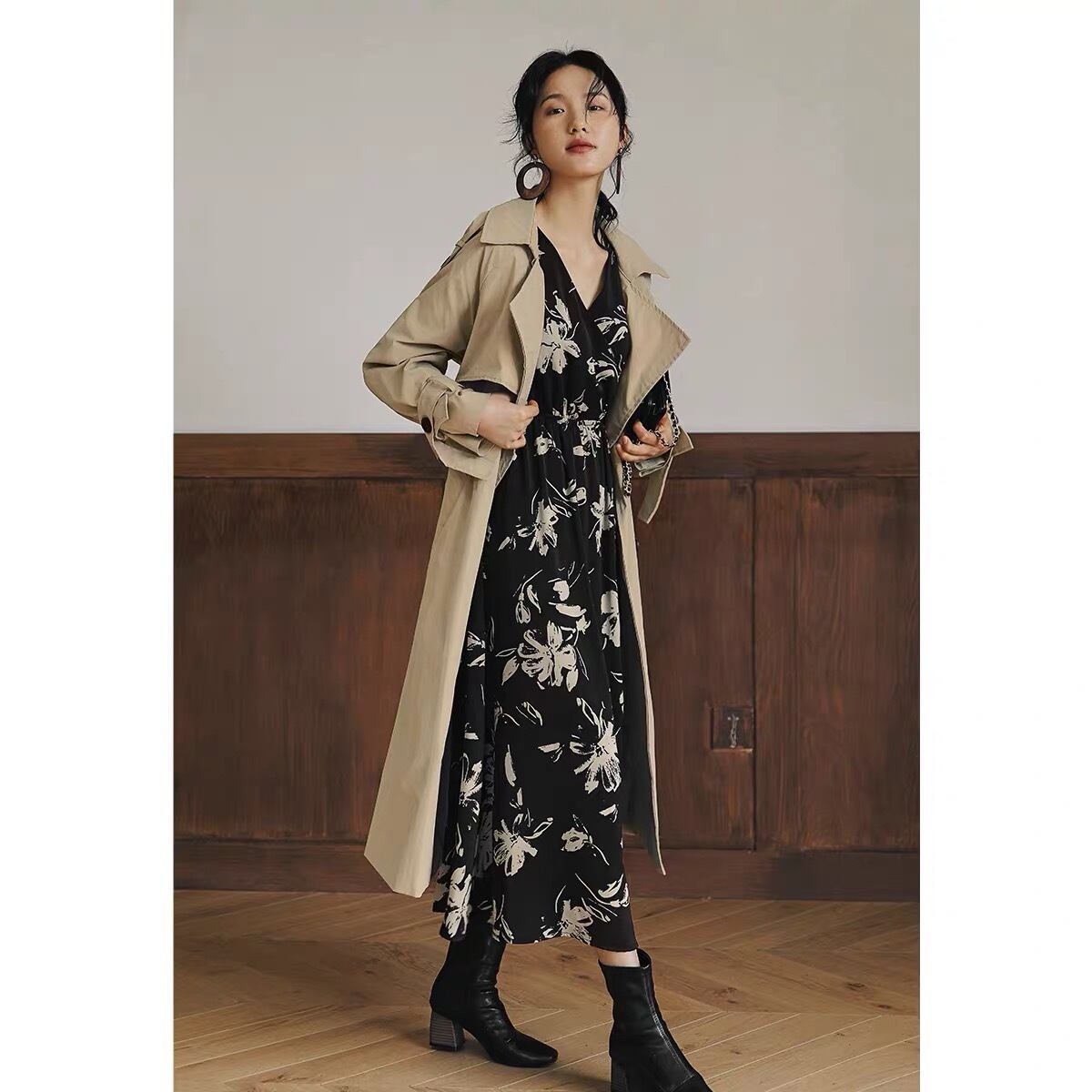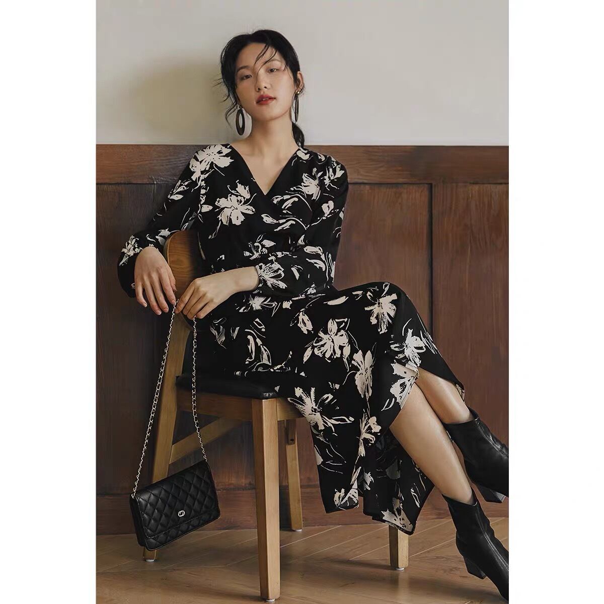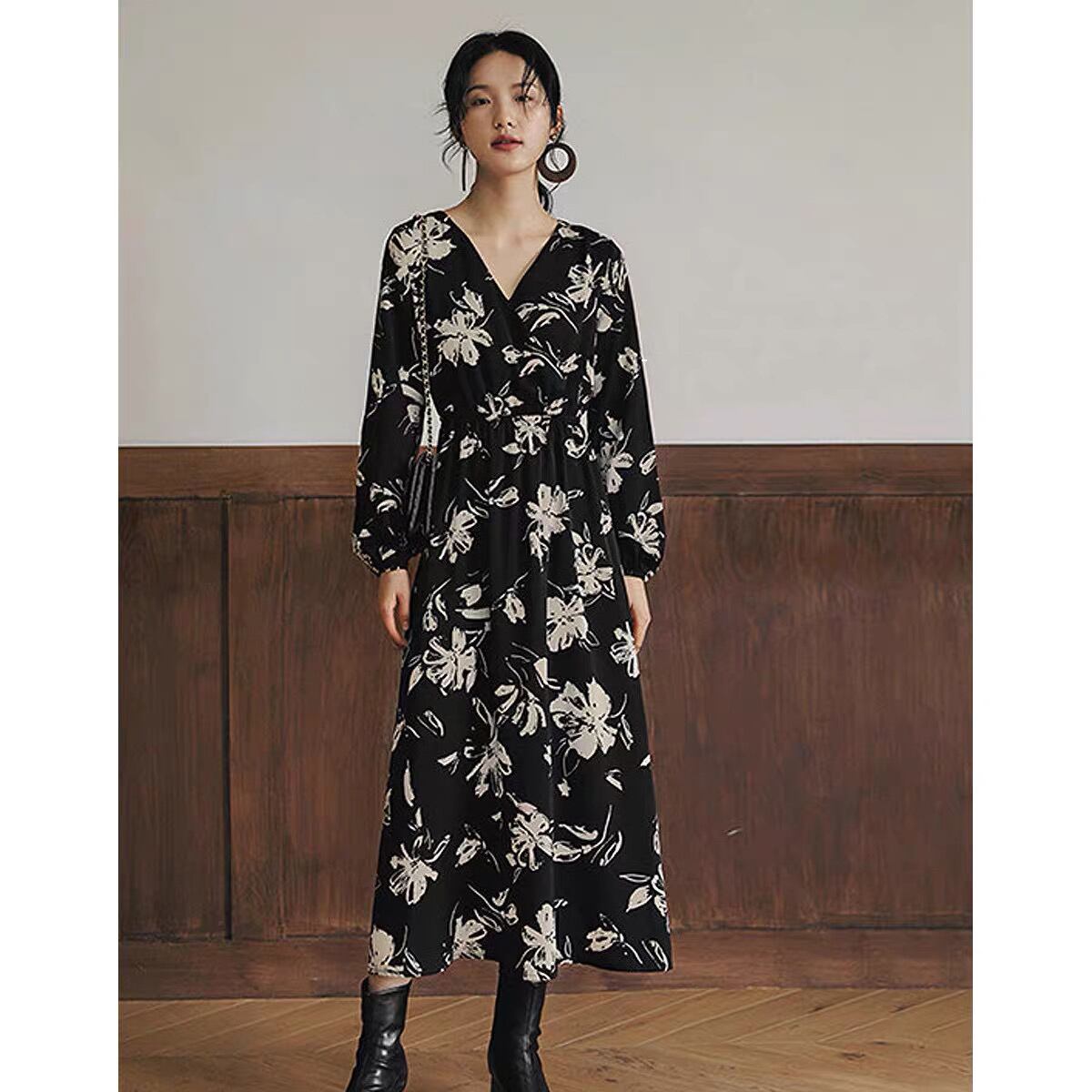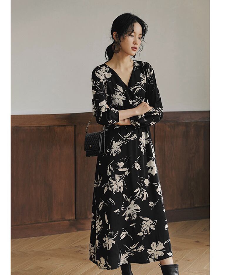 Pinkoz 女性ミディドレスフラワープリント黒ゴシック v ネックフルスリーブ秋冬サッシヘップバーンカジュアルドレス vestidos ピンク ブラック オータム 秋物 ウィンター 冬物 Vネック フラワーデザイン