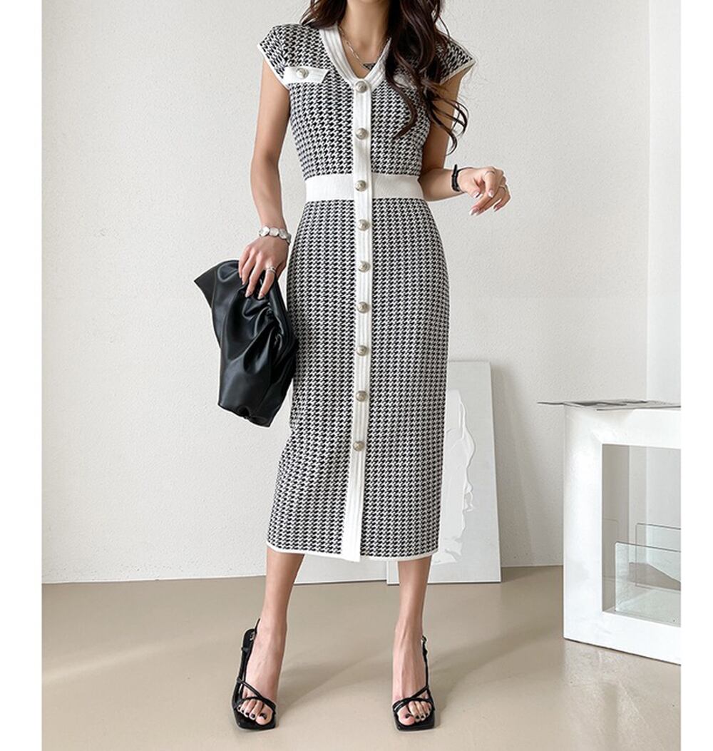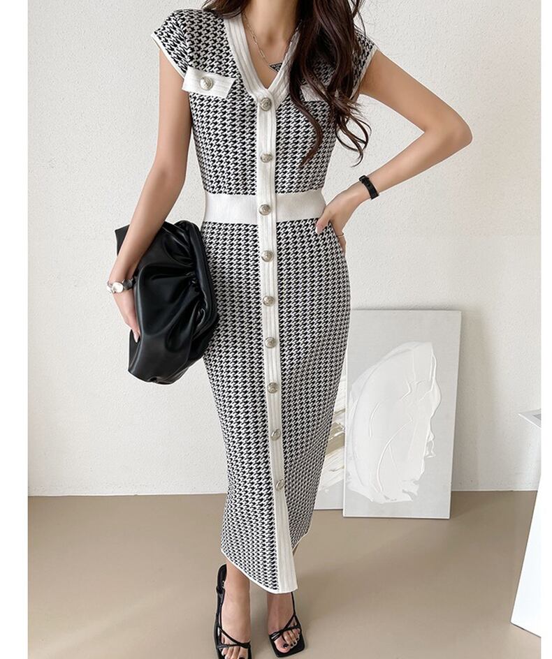 Pinkoz Vネック千鳥格子シングルブレストボタン半袖ハイウェイトミディドレスニットボタン韓国ぬるぬるパーティーファッション ショート ピンク ハーフスリーブ