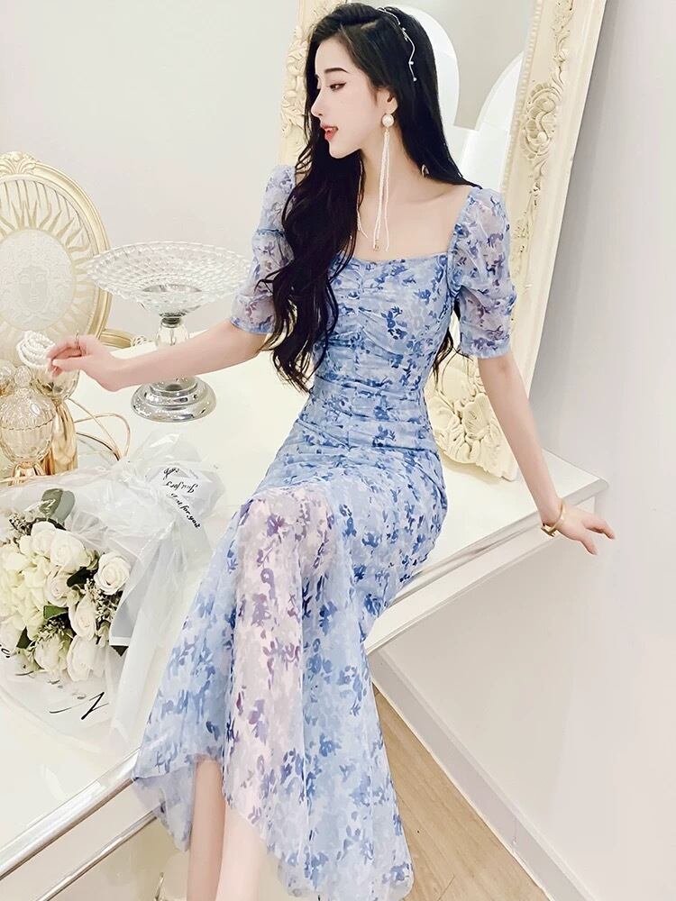Pinkoz 女性エレガントなぬるぬる紫ミディマーメイドドレスセクシーなボディコンスクエアカラー夏パーティーレディドレスファッション vestidos traf ピンク サマー 夏物 パープル スクウェア