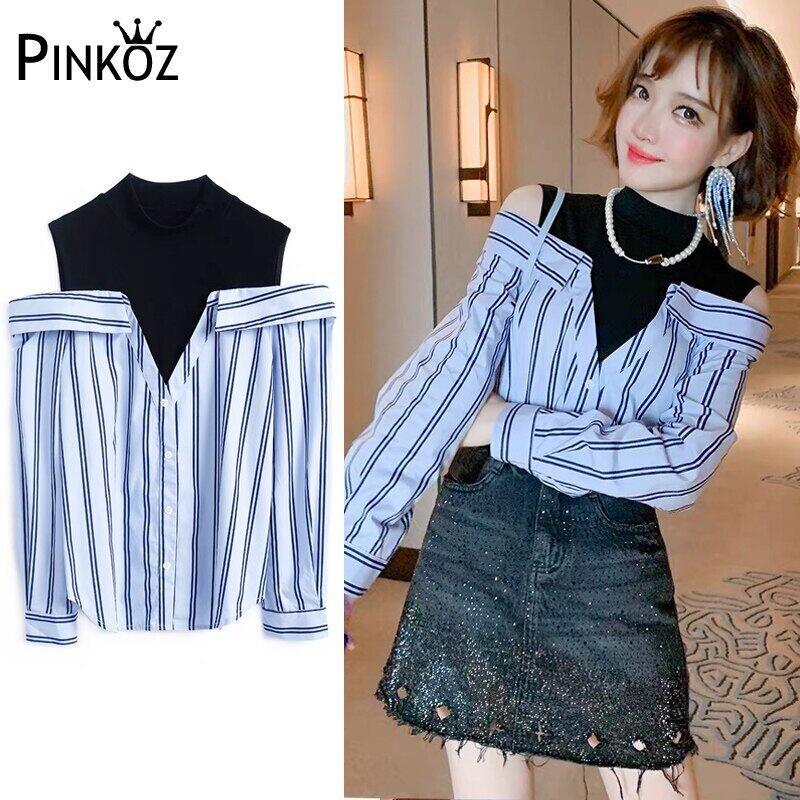 Pinkoz 女性パッチワーク ブルー ストライプ シャツ シングル ブレスト エレガント オフィス レディー ルーズ シャツ ファッション トップス中空アウト ブラウス ヴィンテージ ピンク ビンテージ 会社 学校 通勤や通学にも