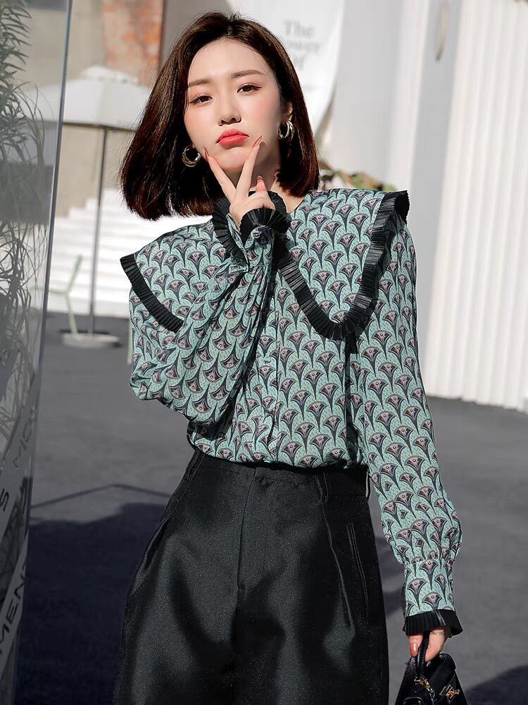 Pinkoz ヴィンテージピーターパンカラーグリーンフローラルプリントデザイナーハイストリート女性アウトドアウェアカジュアルプラスサイズシャツトップスファッション ピンク 大きめサイズ 花柄 ビンテージ