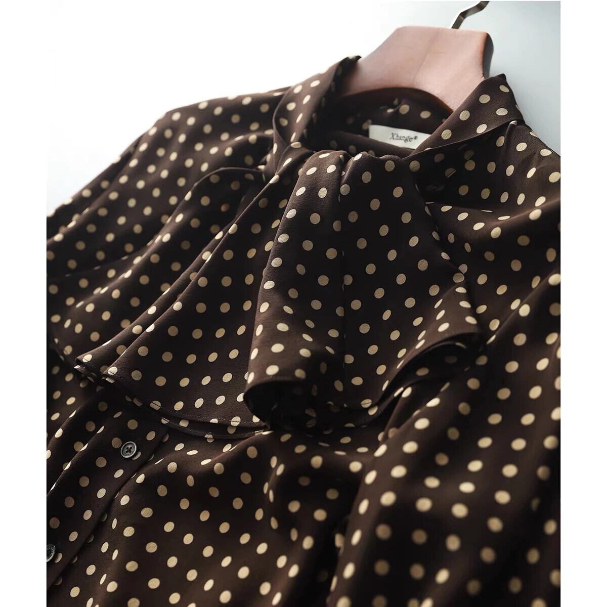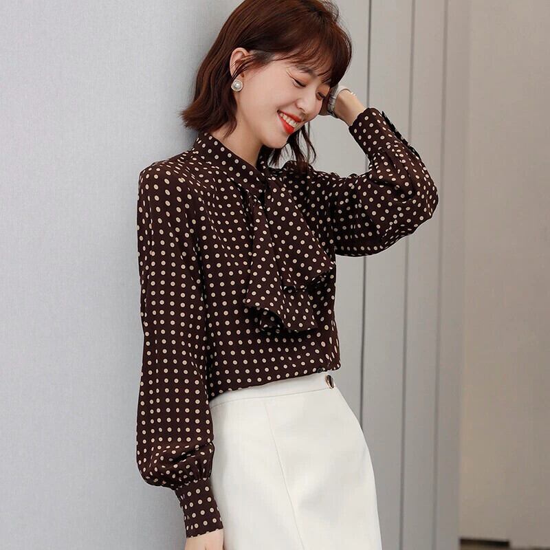 Pinkoz 滑走路デザイナー ブラウン弓襟女性ブラウス女性水玉エレガント オフィス レディー ブラウス シャツ トップス blusas y traf blusa ピンク リボン 会社 学校 通勤や通学にも