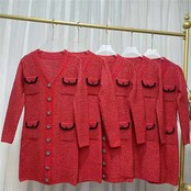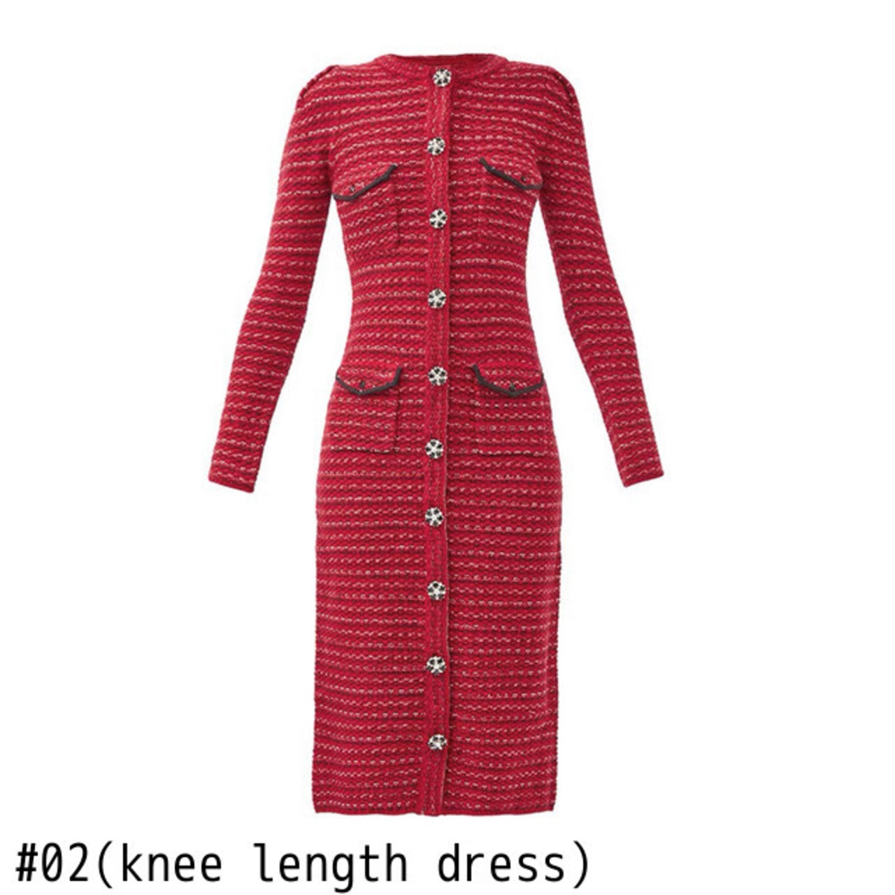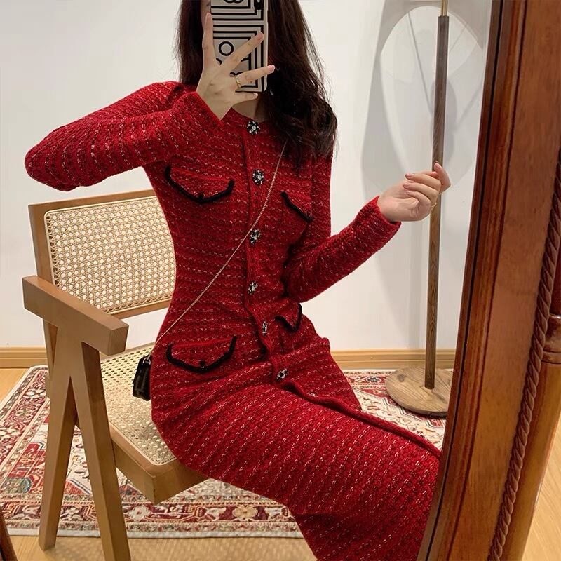 Pinkoz デザイナー赤ミディ冬ドレス女性クリスマスファッション服ボタンポケット長袖編みシックなドレスヴィンテージ ロング ピンク レッド ウィンター 冬物 ビンテージ
