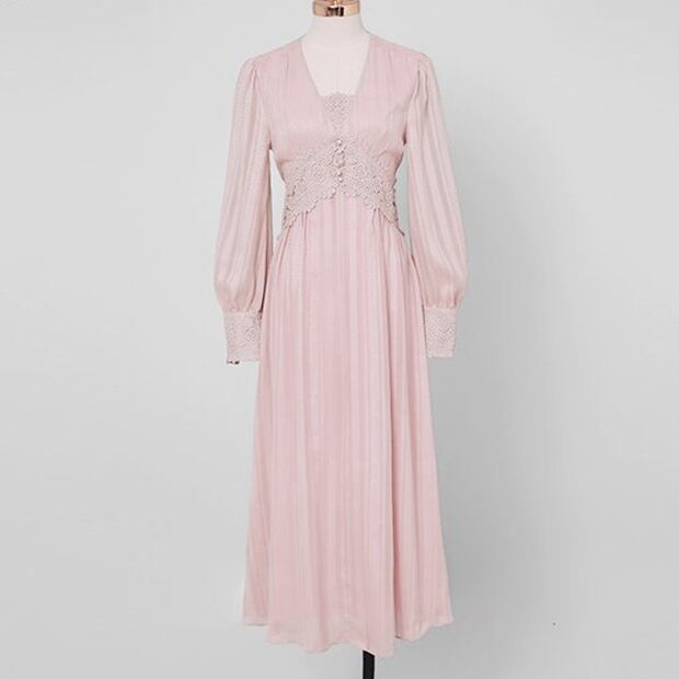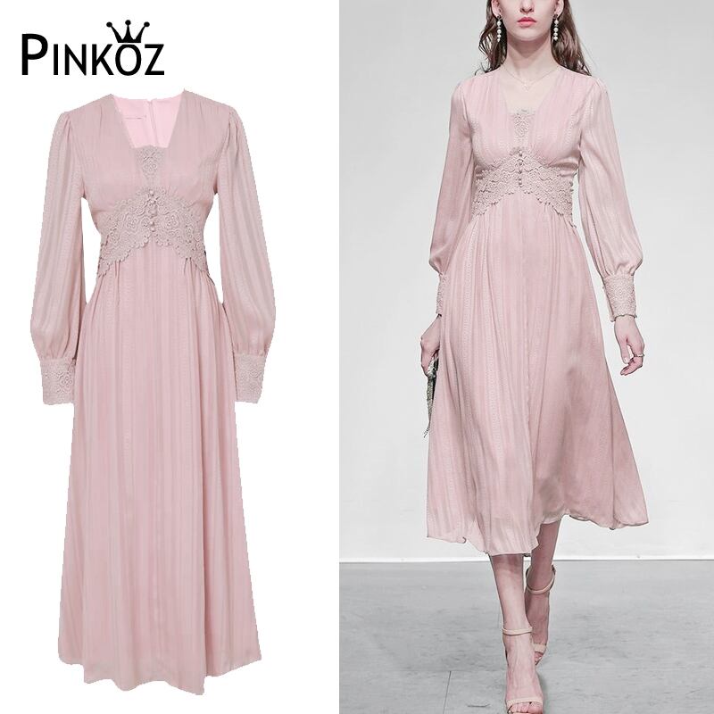 Pinkoz デザイナー スタイリッシュなピンク女性ロング ドレス プリーツ パッチワーク レース ボタン v ネック ファッション ローブ デ mujer vestidos パーティー ドレス Vネック
