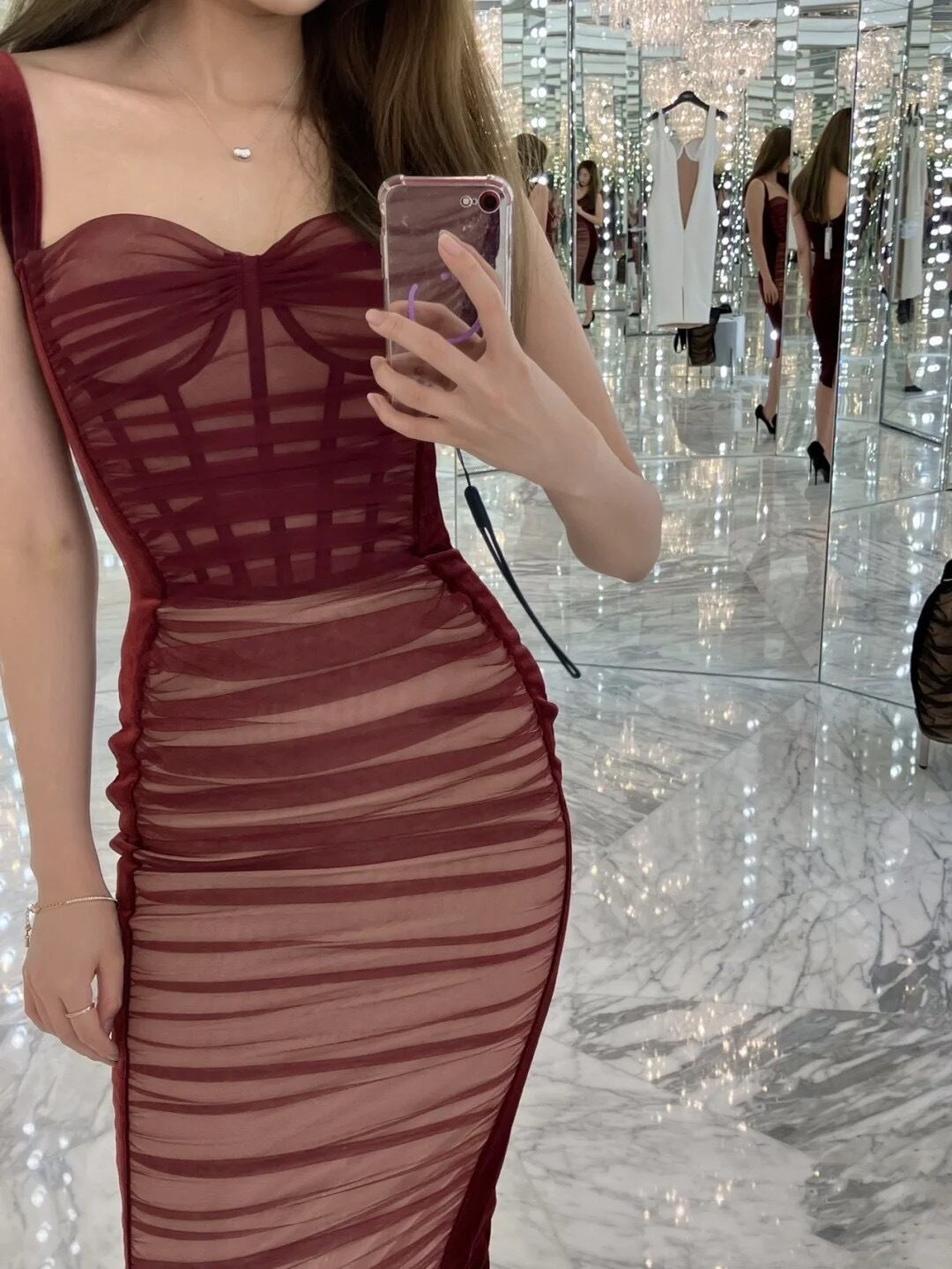 Pinkoz 赤メッシュ mixi ぬるぬるドレス夏パーティー夜スパゲッティ ストラップ キャミソール ディナー ドレス パッチワーク ベルベット ファッション vestidos ピンク レッド サマー 夏物