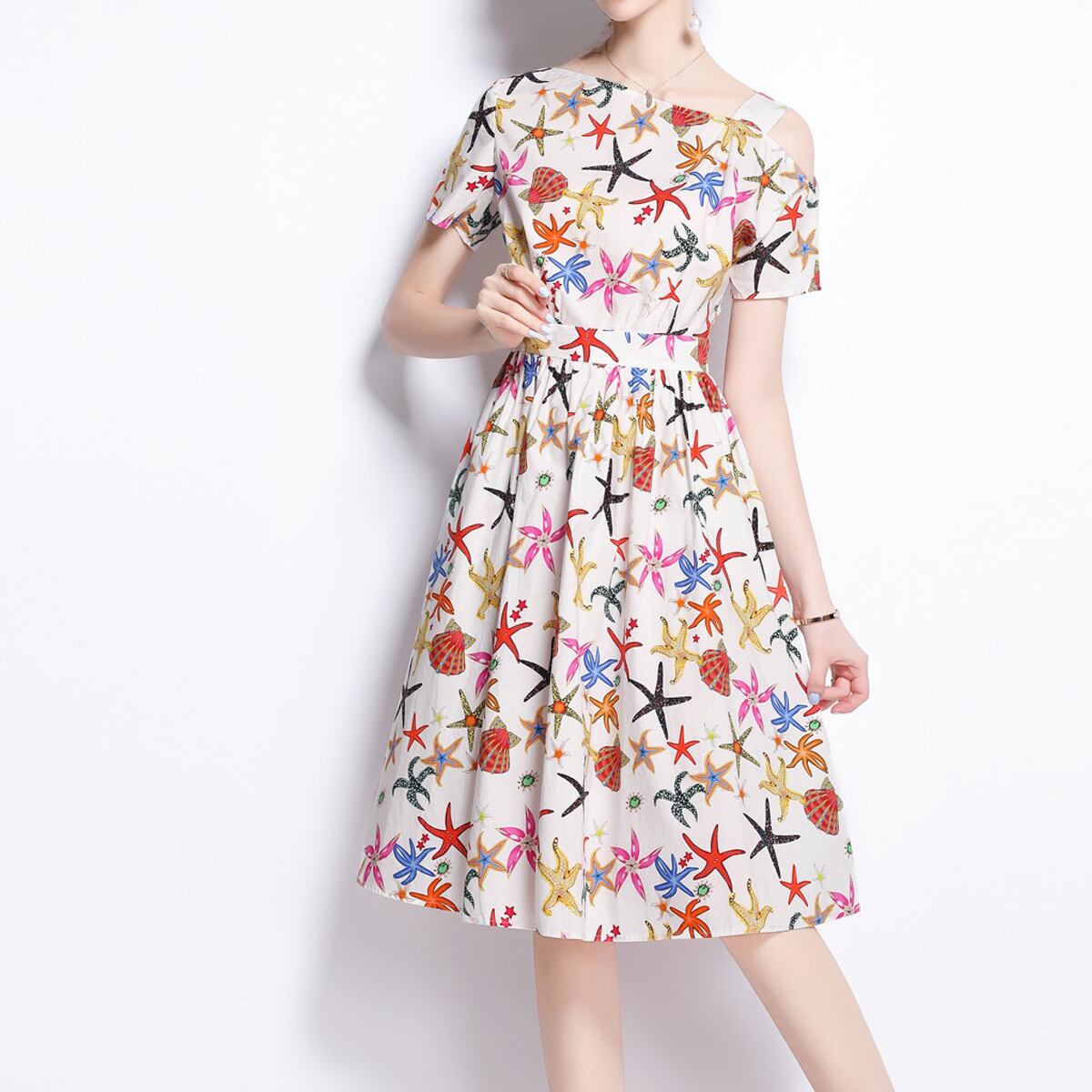 Pinkoz ヒトデ プリント半袖デザイナー夏休日 fashiong 女性服 A ライン カジュアル レディー ミディ ドレス大きいサイズ ショート ピンク ハーフスリーブ 大きめサイズ サマー 夏物 Aライン
