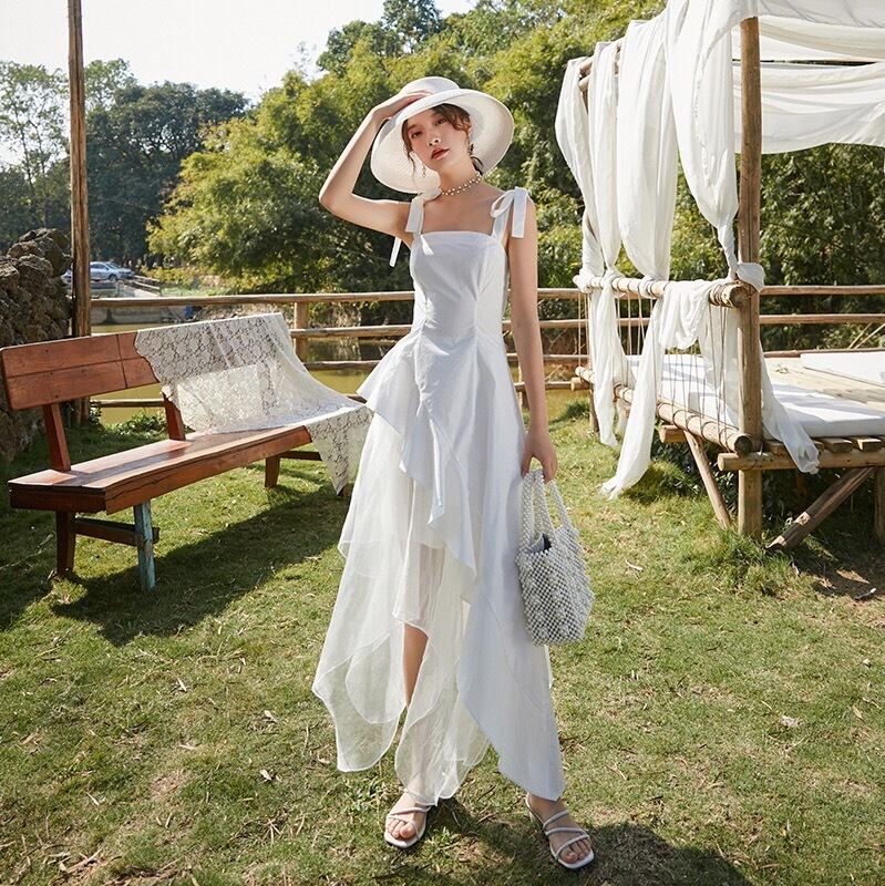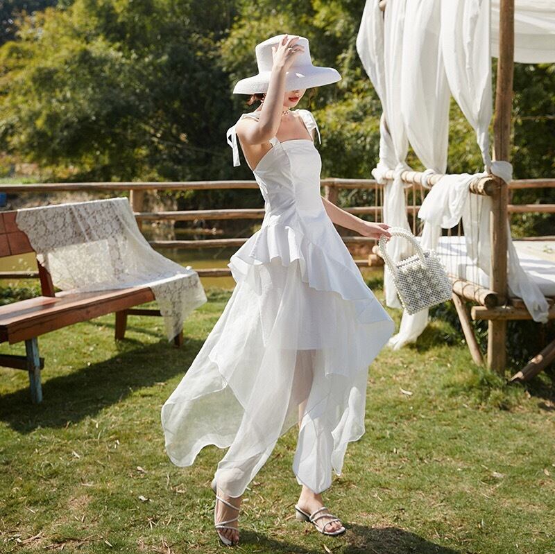 Pinkoz 新しい白いパッチワーク メッシュ サマー ドレス スパゲッティ ストラップ レースアップ ホリデー エレガントな非対称ロマティック フランス語 платье ピンク ホワイト 夏物