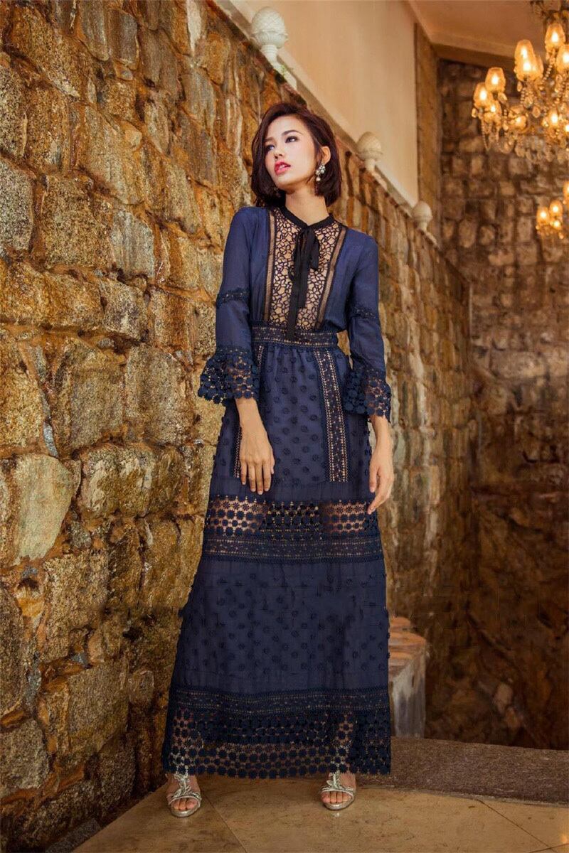 Pinkoz デザイナー紺パーティー マキシ ドレス女性パッチワーク レース中空アウト弓レースアップ vestidos ナイト ローブ za ピンク ブルー リボン